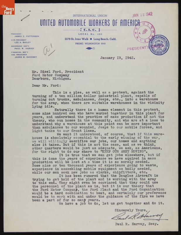 Letter from UAW-CIO to Edsel Ford Protesting Turning the Long Beach Assembly Plant into an Army Warehouse, January 19, 1942