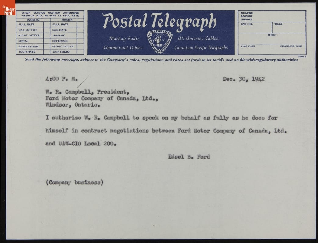 Telegram from Edsel Ford Authorizing W. R. Campbell to Negotiate with UAW-CIO in Canada, December 30, 1942