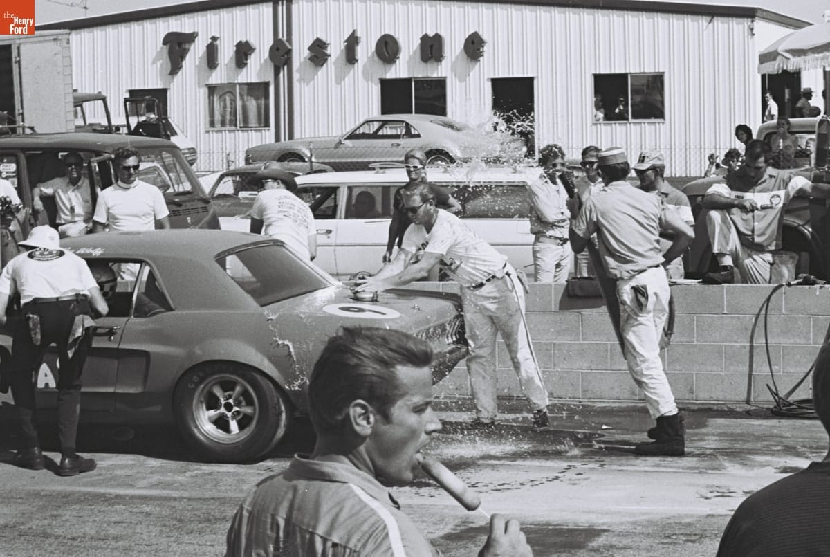Dave Friedman captured and preserved auto racing history through his photography. His work -- and his collection of works by other photographers -- documents key races, cars, drivers, and teams. This photo was taken at the Mission Bell 250, a Trans-Am race at California's Riverside International Raceway on September 8, 1968. Horst Kwech won with the #2 Ford Mustang from Shelby Racing.