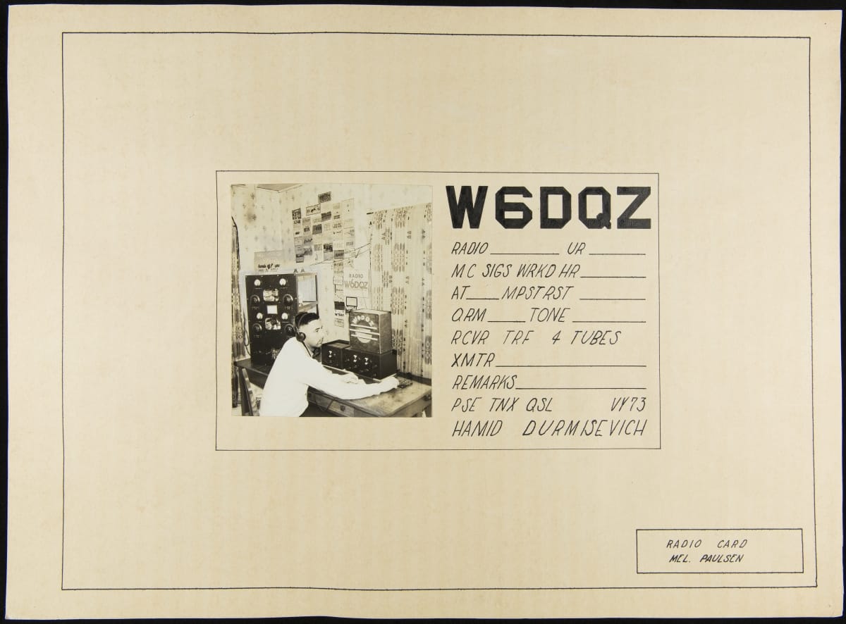 Hamid (Charlie) Durmisevich, call sign W6DQZ, connected to the world from his ham radio station in Los Angeles. Amateur radio operators use two-way radios to talk to global networks of other "hams" about technology, weather, emergency preparedness and daily life. This ham, who emigrated from Eastern Europe in 1920, was active in amateur radio communities from the 1930s to 1990s.