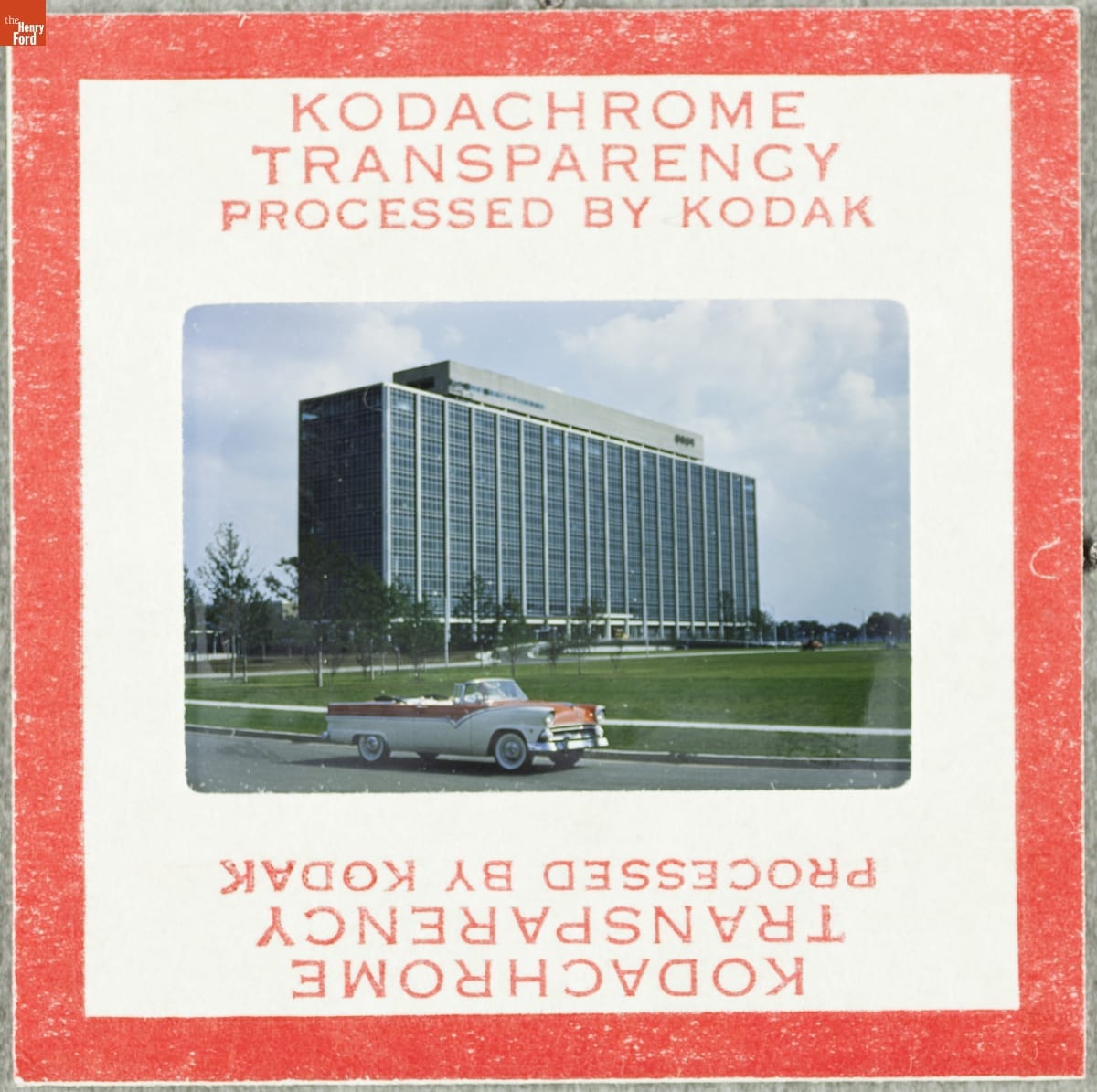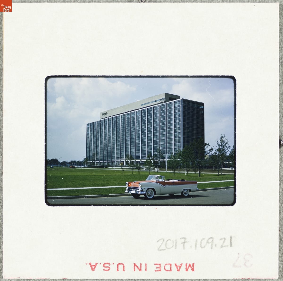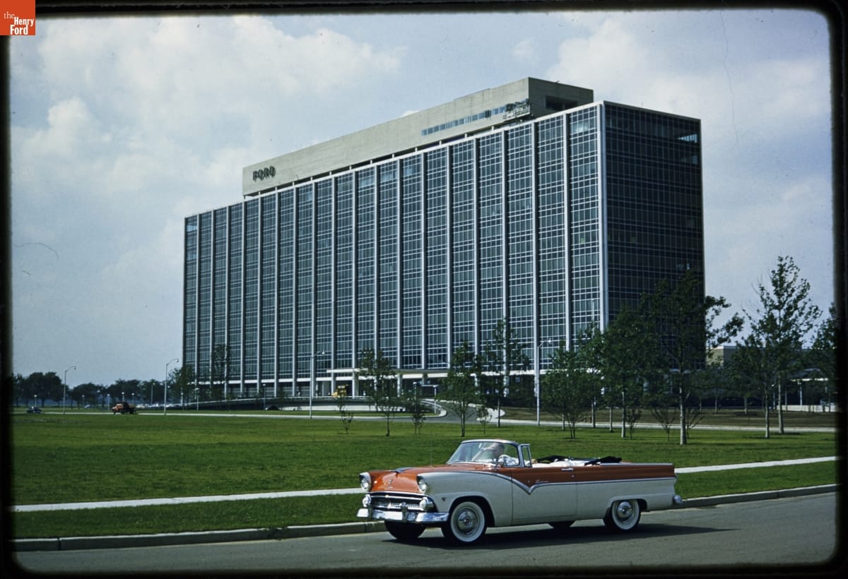 South Facade with 1955 Ford Convertible, Henry Ford II World Center, circa 1955