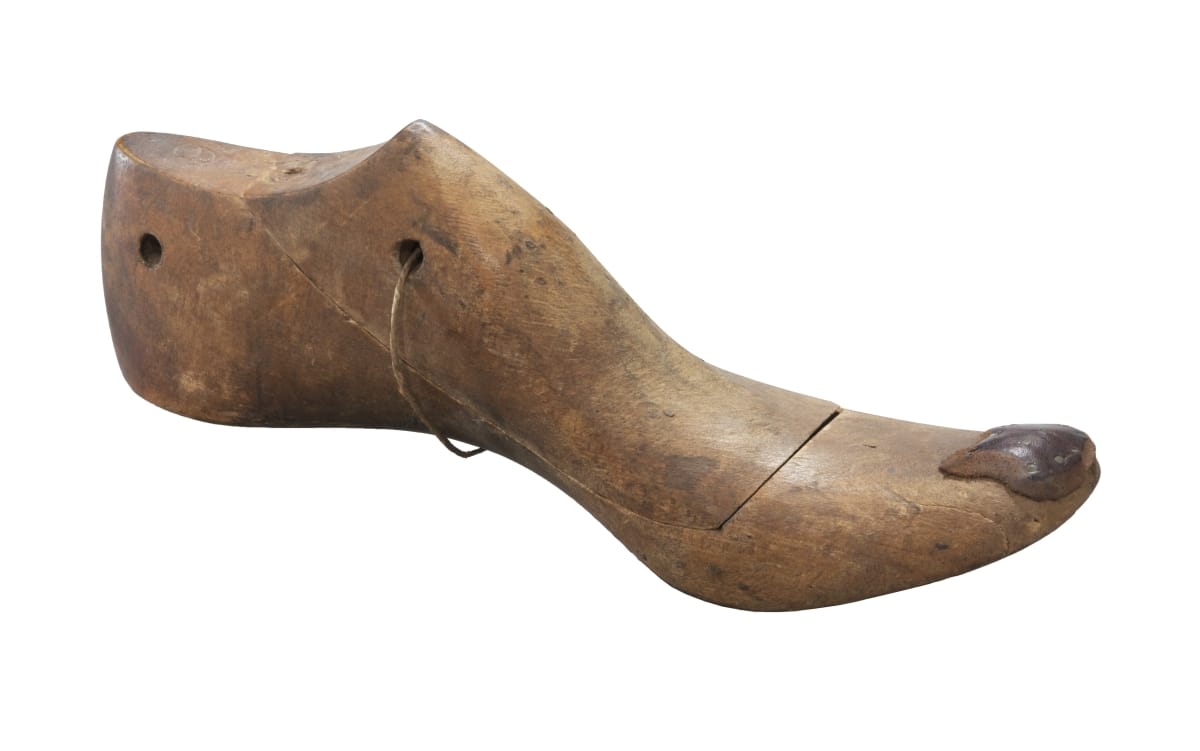 Shoemakers in the late 19th and early 20th centuries molded pieces of leather around a wooden foot-like form, known as a last, to create a shoe. Some lasts had a removeable block, which made it easy to extract the wood form from the shoe. Others had a hole in the end where a hook could be inserted to pull the last out. Some had both.