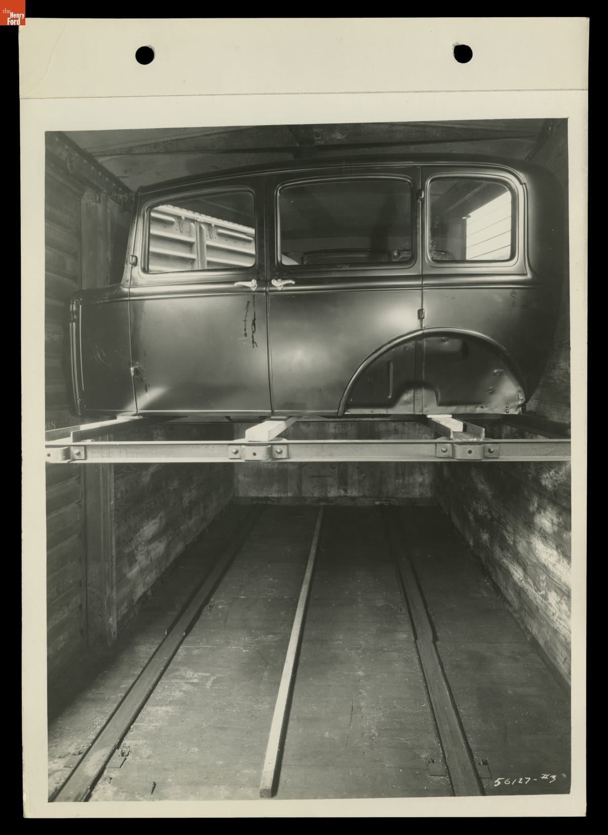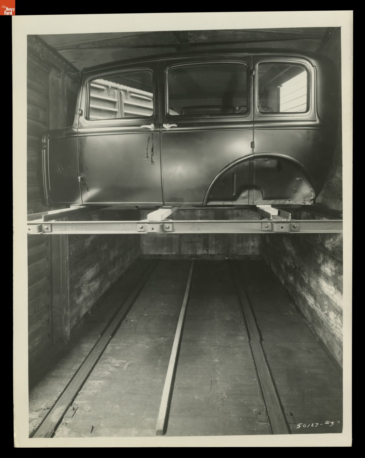 Ford Motor Company made most of the bodies used on its Model A vehicles, but some were built by outside vendors like Briggs, Budd, and Murray. This photograph shows a four-door sedan Model A body loaded onto a railroad car. The body was then shipped to Ford, where it was mounted onto a chassis.