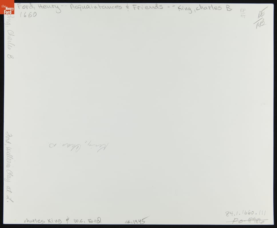 Charles Brady King (right) built and drove the first automobile in Detroit in March 1896, three months before Henry Ford finished his Quadricycle. In this circa 1945 photo, King shows various model railroad locomotives and steam engines to Ford's grandson, William Clay Ford. King gifted some of his models to Henry Ford Museum and Greenfield Village.