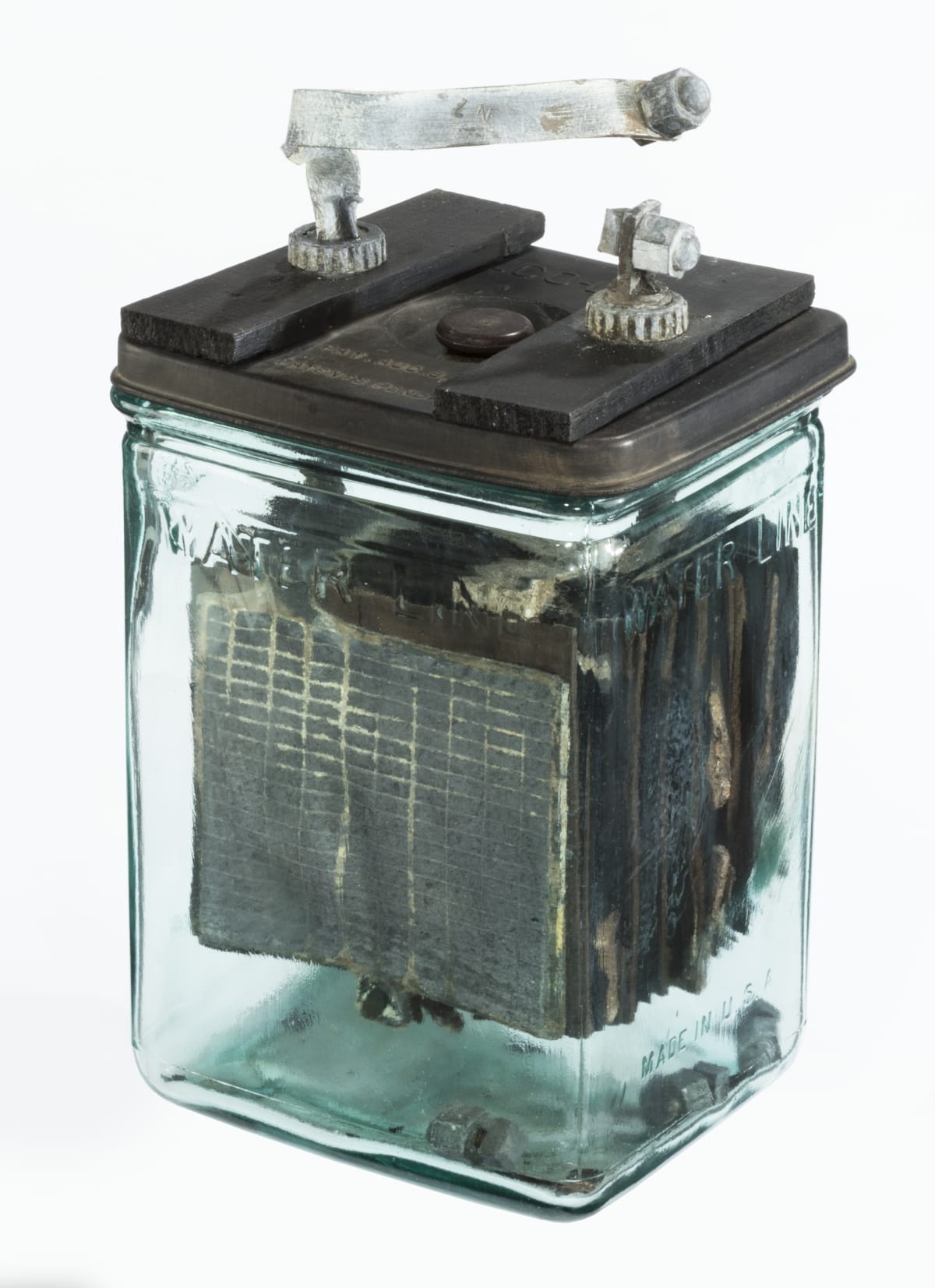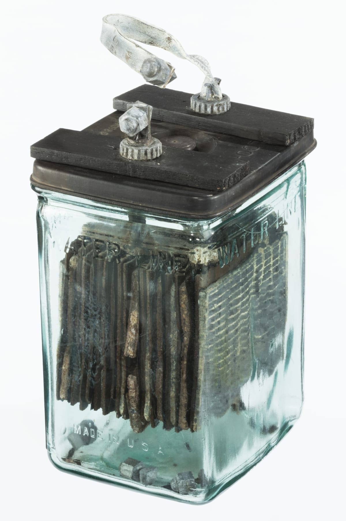 In the late 19th and early 20th centuries, people used batteries to power telegraph and telephone systems, ring bells and alarms, run small appliances, or spark gasoline engines. A variety of companies produced wet cell batteries to meet this growing need. The glass jar held a conductive solution surrounding the carbon and zinc elements that produced an electrochemical reaction.