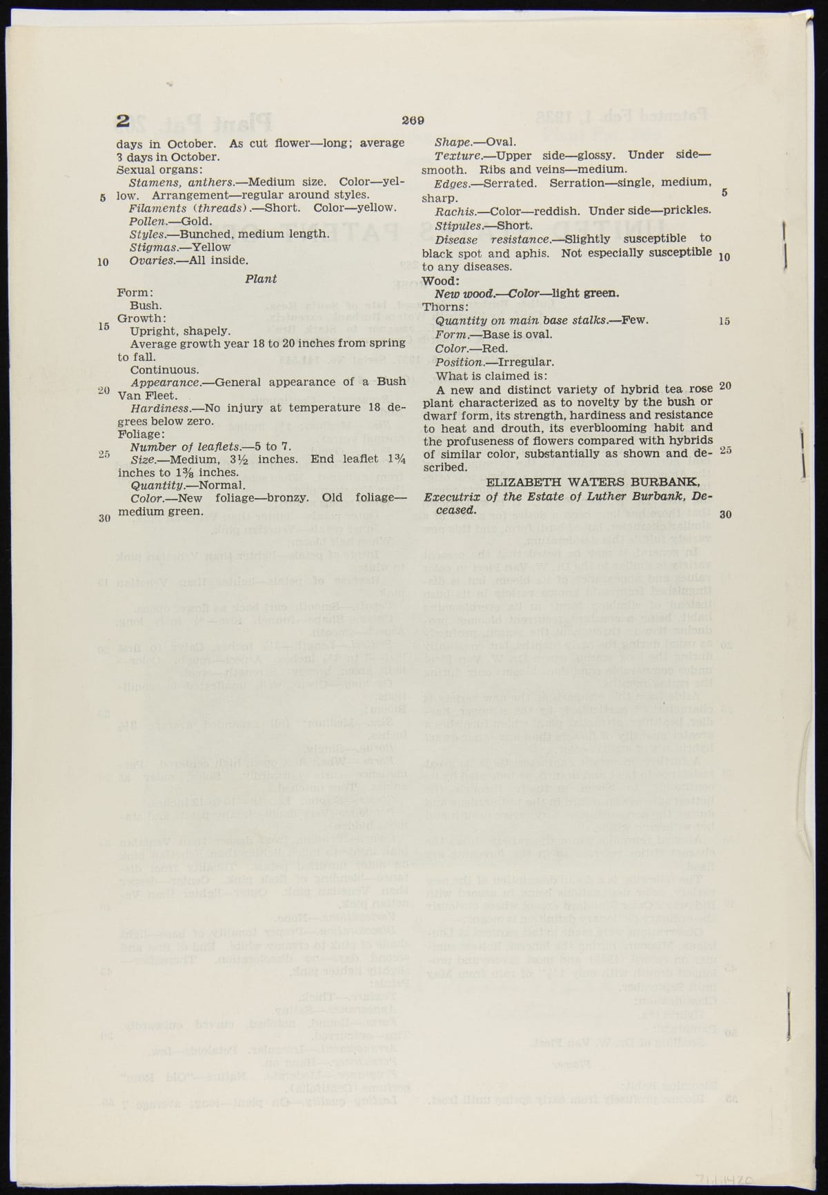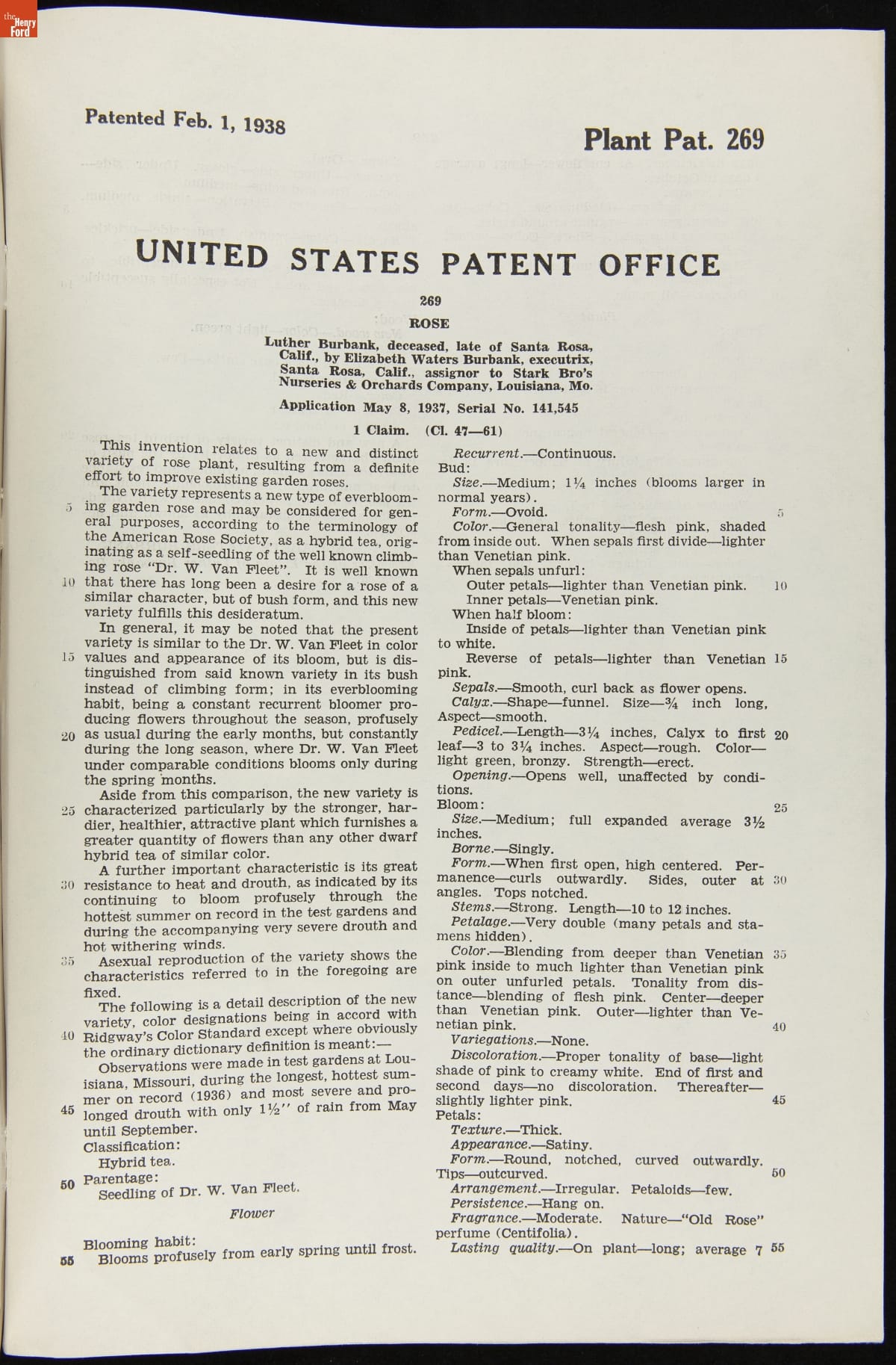 U.S. Plant Patent 269, for Luther Burbank Rose, Granted to Elizabeth Waters Burbank, February 1, 1938