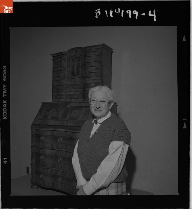 Donor Ruth Adler Schnee with Secretary Desk at Henry Ford Museum, October 21, 1999
