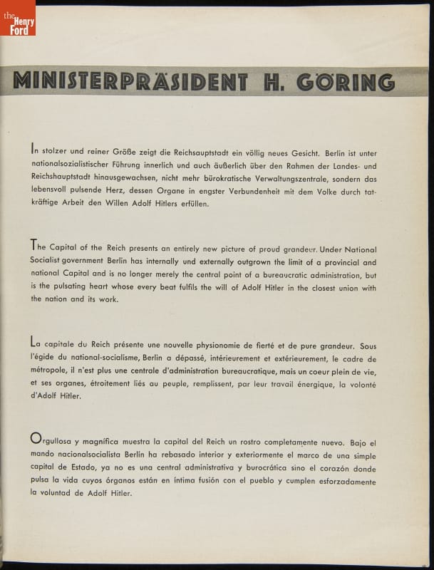 German National Socialist propaganda permeates this 1936 Berlin Olympic Games travel guide. The guide expounds the rise of a New Germany with glowing images of the city, but it belies the ethnic and racial hatred underpinning the Nazi regime. Adolf Hitler hoped the games would demonstrate "Aryan" racial superiority. Athletes like U.S. track star Jesse Owens, who won four gold medals in 1936, disproved him.