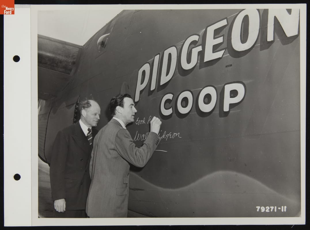 Actor Walter Pidgeon visited Ford Motor Company's Willow Run bomber plant on January 21, 1944. Pidgeon good-naturedly signed an airplane named Pidgeon Coop in his honor. At peak production, Willow Run completed one B-24 Liberator bomber every 63 minutes. Americans considered it an industrial marvel. Other famous visitors to the plant included filmmaker Walt Disney and newspaper magnate William Randolph Hearst.