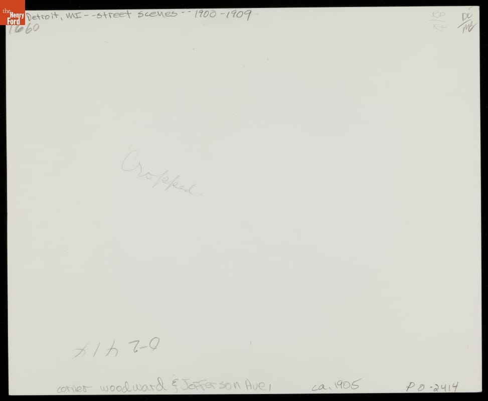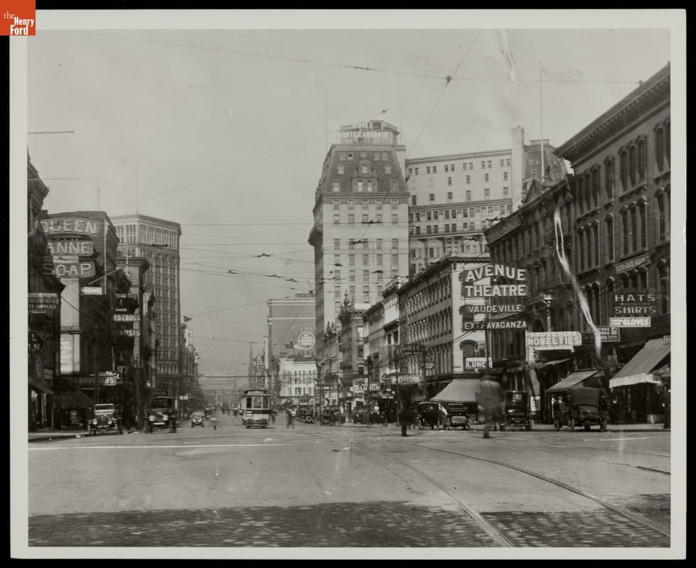 In turn-of-the-century downtown Detroit, pedestrians shared the streets with electric streetcars and automobiles.