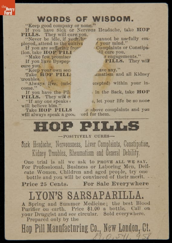 Trade Card for Hop Pills, Hop Pill Manufacturing Co., 1880-1890