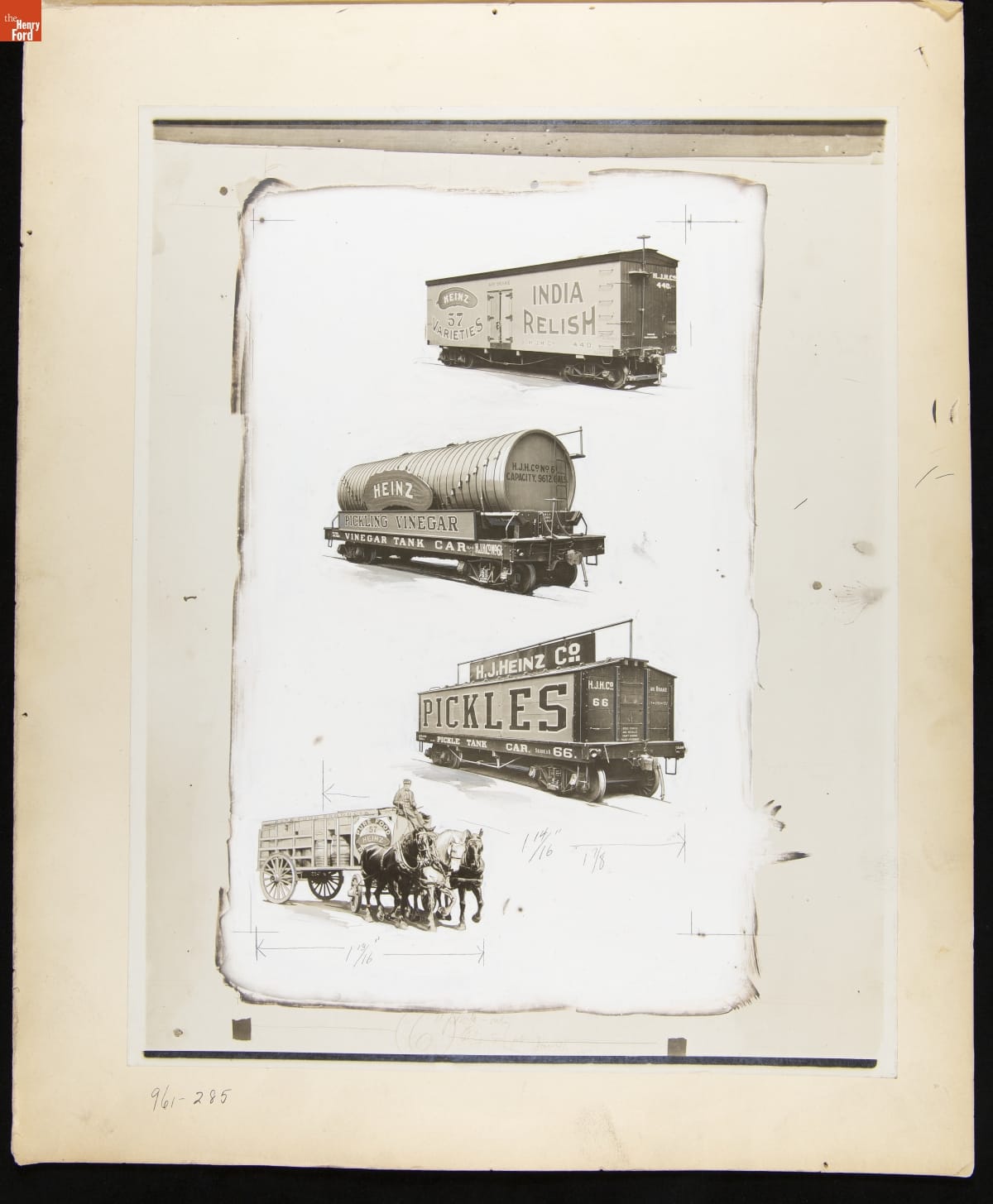 Photographs of the H.J. Heinz factory -- including buildings, employees, transportation methods, and the manufacturing process -- were often taken and then modified for advertising and publications. This advertising layout features modified photographs of box cars, a tank car, and a horse-drawn wagon. This arrangement of photos promoted the various methods of transportation used by the H.J. Heinz Company.
