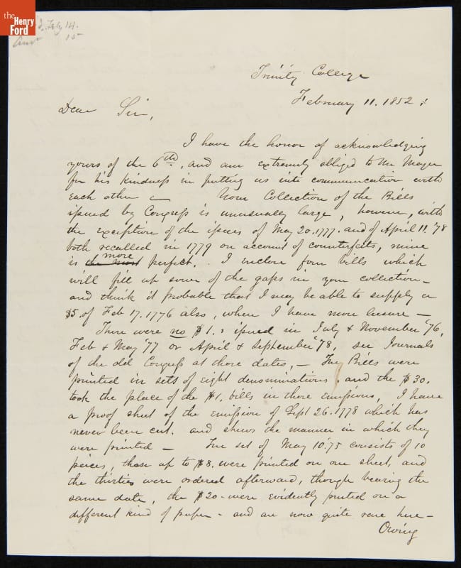 Joshua Cohen (1801-1870) collected autographs, historical documents, and colonial and Continental currency. Cohen, who lived in Baltimore, Maryland, corresponded and traded with other well-known 19th-century collectors to amass his fine collection. In this letter, Charles Hoadly comments of the completeness of his and Cohen's collections. He also offers some bills that "will fill up some of the gaps" in Cohen's collection.