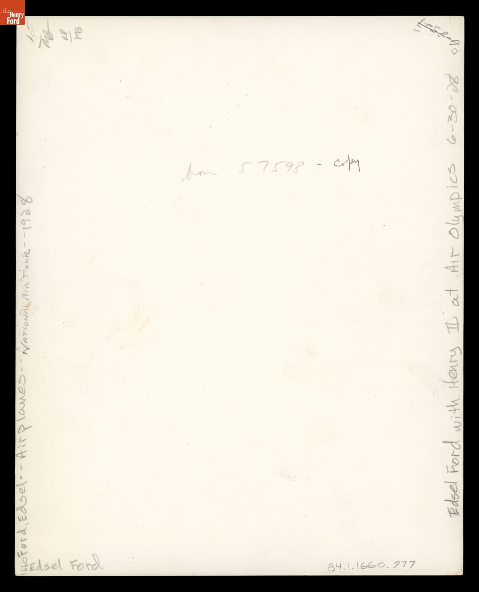 Edsel Ford was photographed with his son, Henry Ford II, at the 1928 Ford Reliability Air Tour. The tours, organized to promote reliability and safety in commercial aircraft, were held annually from 1925-1931. They tested airplanes' abilities to maintain speeds and schedules. Henry Ford credited Edsel Ford with sparking Ford Motor Company's interest in aviation.