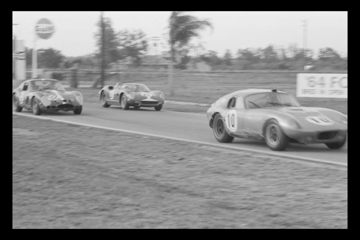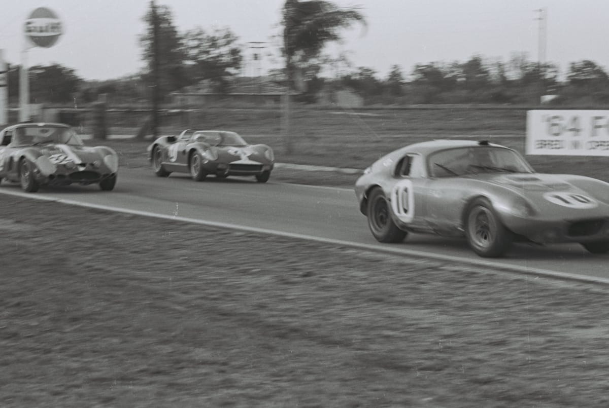 Dave Friedman has captured and preserved auto racing history through his photography. His collection of works documents key races, vehicles, drivers, and teams. In March 1964, Ferrari -- as expected -- topped the prototype class at the 12 Hours of Sebring road race. The surprise, however, was the performance of the Carroll Shelby Cobras. They outclassed Ferrari in the GT class and swept the top three spots.