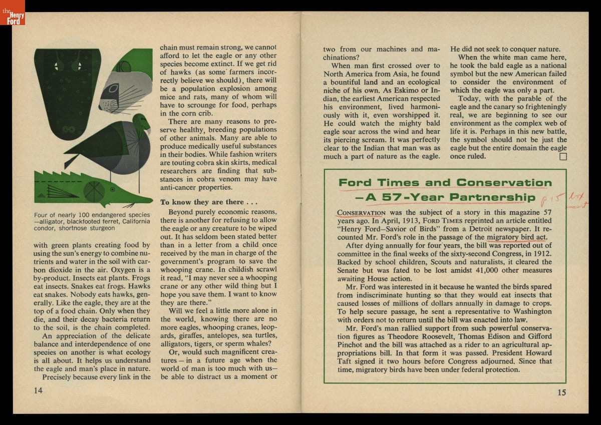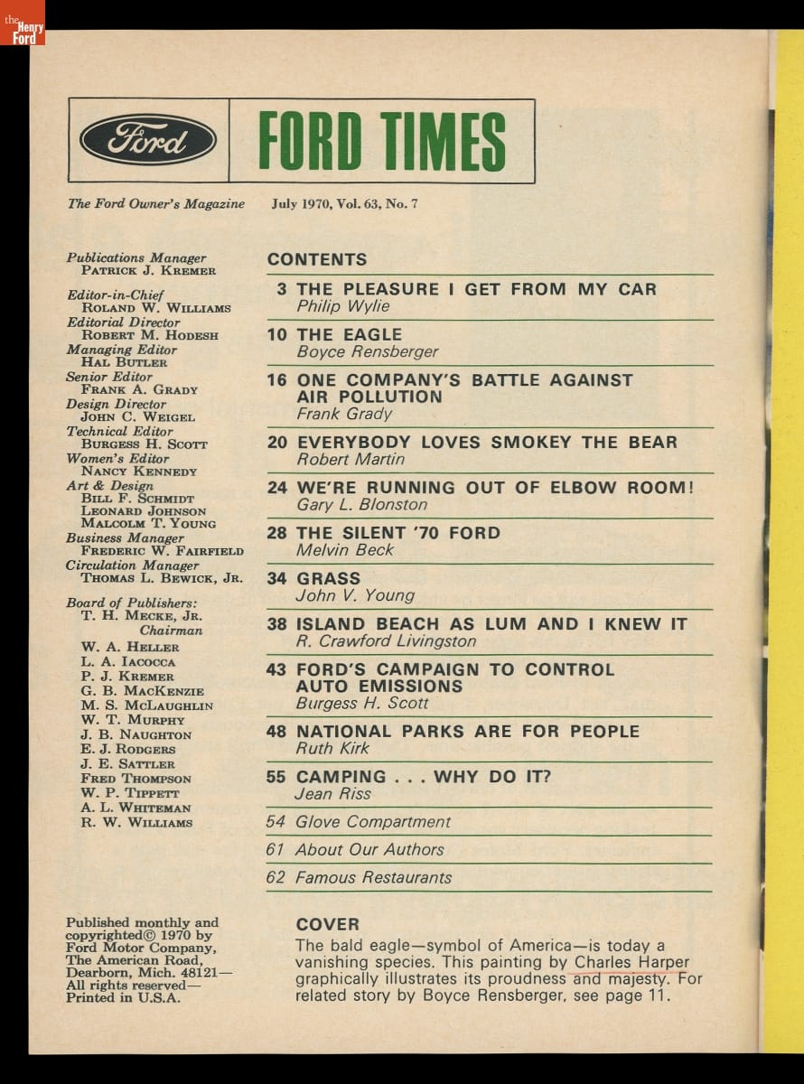 Manufacturers responded to growing public concern -- and increased media scrutiny -- about pollution by sharing their perspective with readers. Ford Motor Company addressed matters associated with the automotive industry in a special issue of its monthly publication, Ford Times. In addition to reducing air pollution from processing metals, vinyl, and other automotive components, the company addressed topics such as fuel efficiency and emissions.