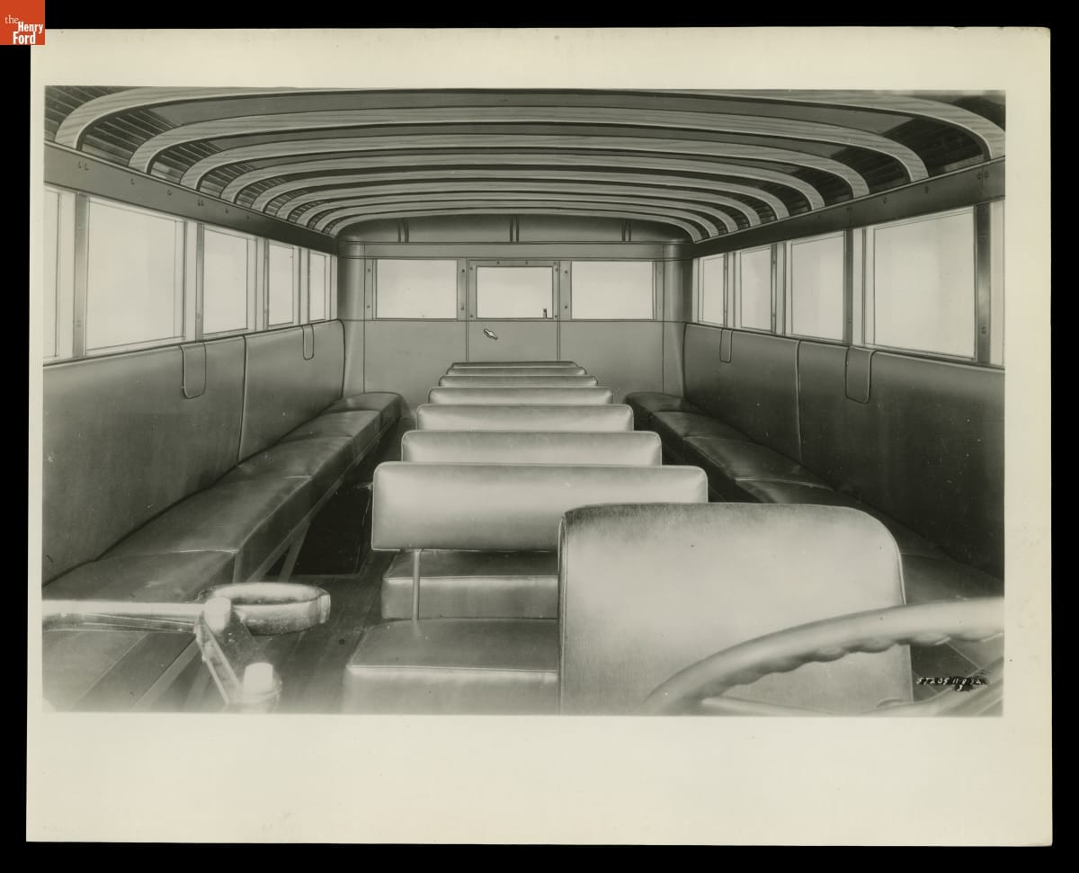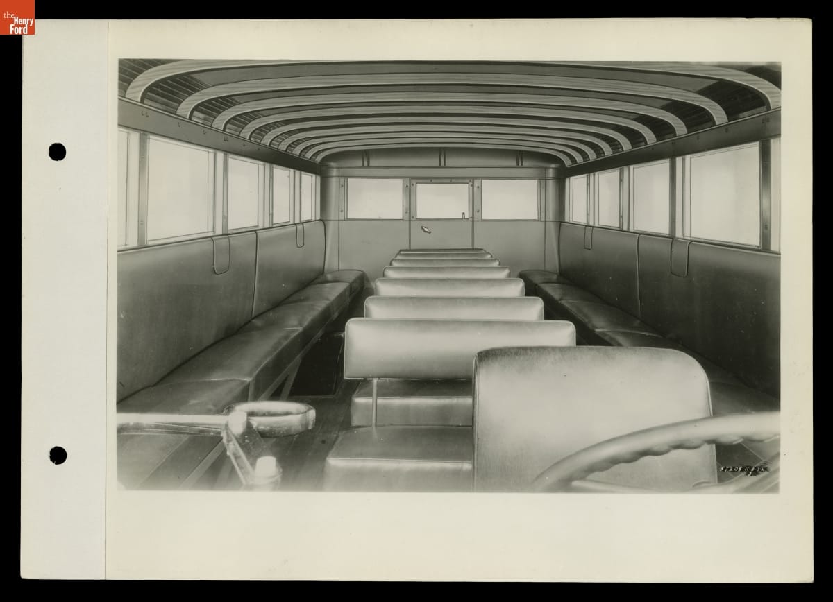 Ford Motor Company expanded its commercial lines to combat sagging Depression-era sales. On its truck chassis, the automaker offered everything from police patrol vans and ambulances to garbage trucks and school buses. This photo, taken inside a 1932 Ford school bus, shows how capacity was maximized with seats running along the sides and down the center.