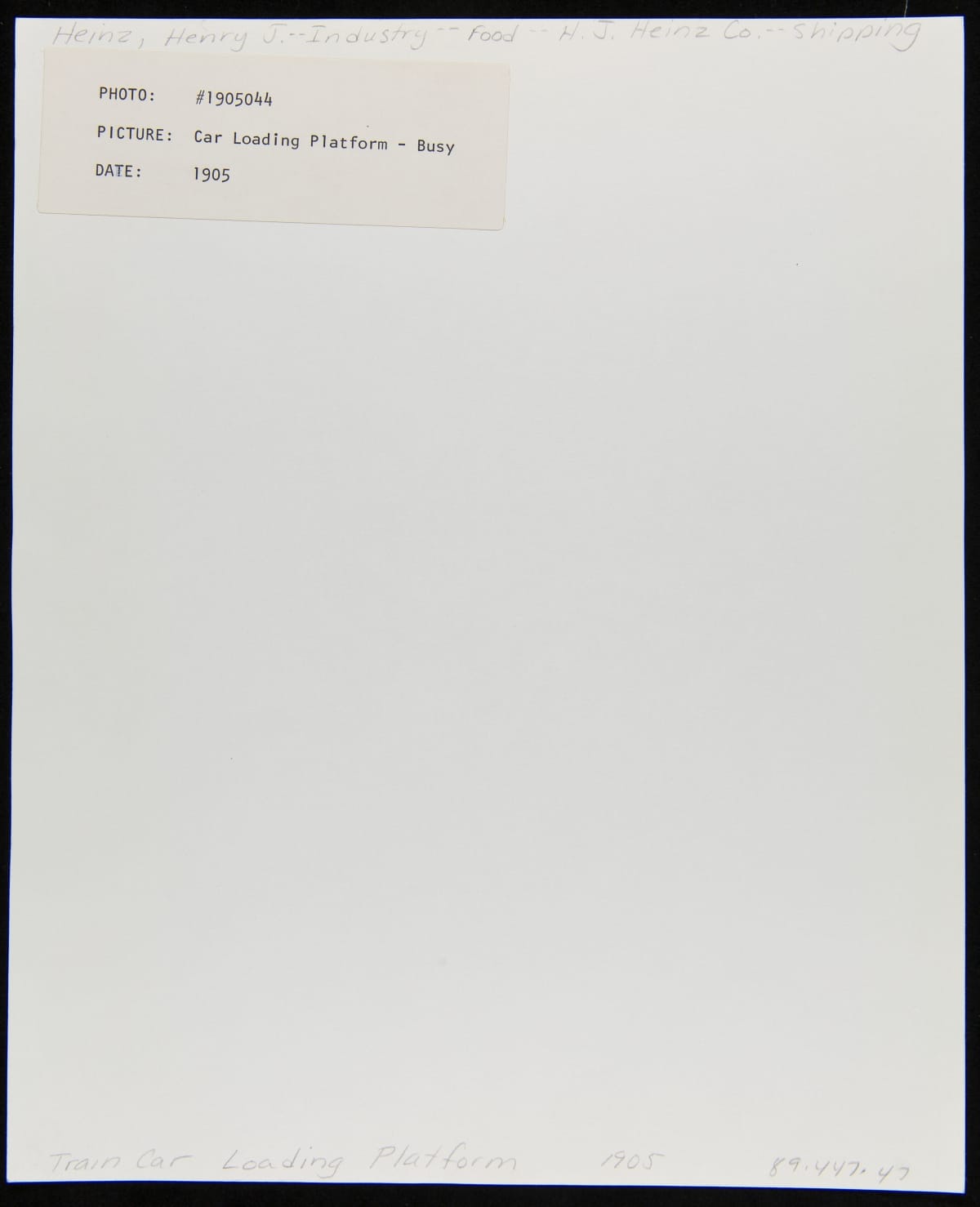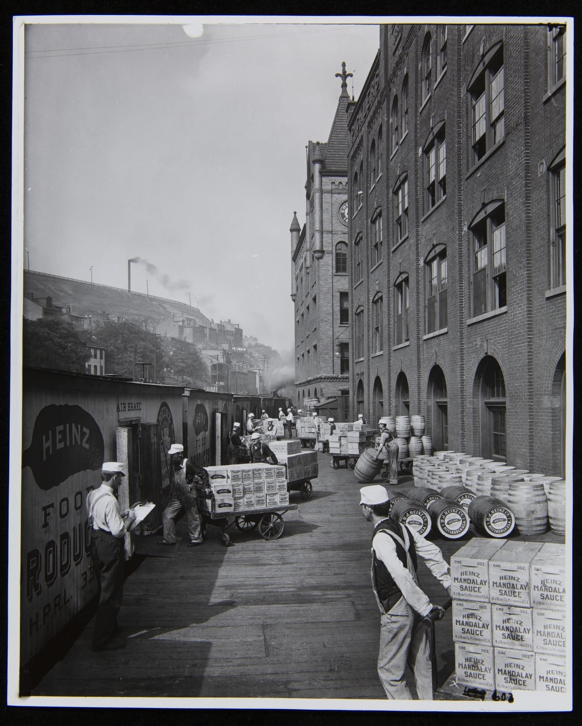 The H.J. Heinz Company had its own line of railroad cars and designated tracks, which brought the trains to the loading platform alongside the main plant in Pittsburgh, Pennsylvania. This greatly reduced the time needed to load the cars as employees could bring boxes and crates right out of the factory and into the train cars. This photograph shows the loading platform at the main plant.