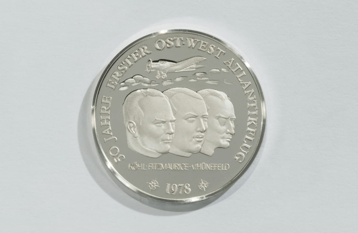 The city of Bremen, West Germany, issued this commemorative coin in 1978 to mark the 50th anniversary of the transatlantic flight of the Bremen. Crewed by Hermann Kohl, James Fitzmaurice, and Ehrenfried Guenther von Huenefeld, the Bremen's flight was the first east-to-west crossing, made against prevailing westerly winds.