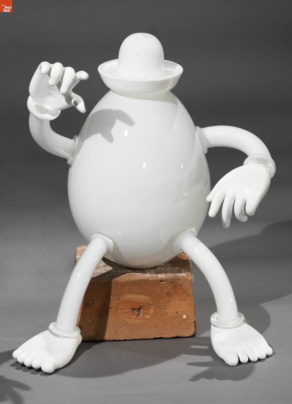 Dave Walters loves narrative in his sculptures. Initially fascinated with Classical mythology and subjects like Aesop's fables, he found that audiences responded to more accessible fairy tales and nursery rhymes, which is how he turned to the Humpty Dumpty story. This piece in his long-running series is fabricated from Greenfield Village glass.