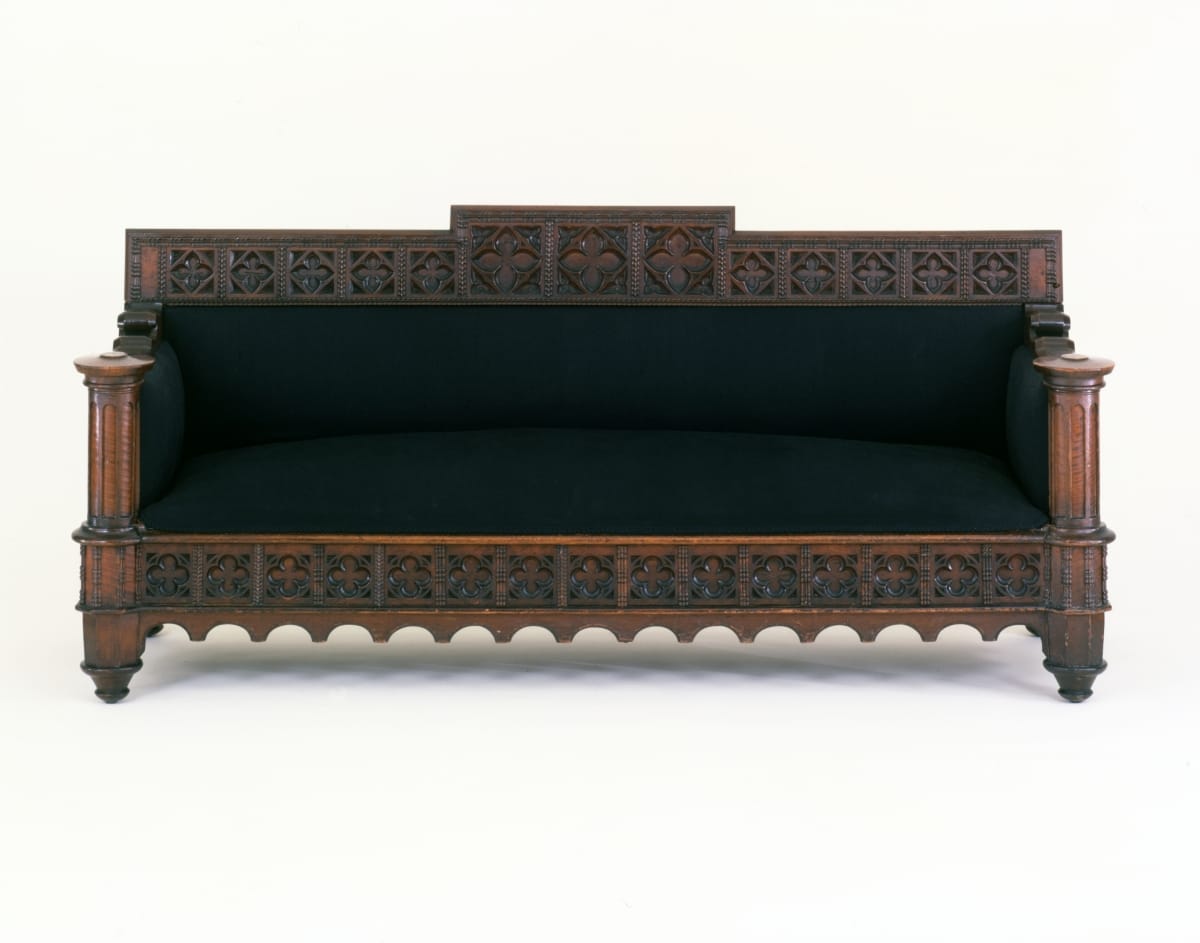 Gothic Revival furniture with this level of sophistication is rarely seen. The crest and seat rails consist of rows of quatrefoil, or four-part leaf forms, derived from medieval stained glass windows. This large scale piece was intended to make a fashion statement in a well-appointed Victorian interior.