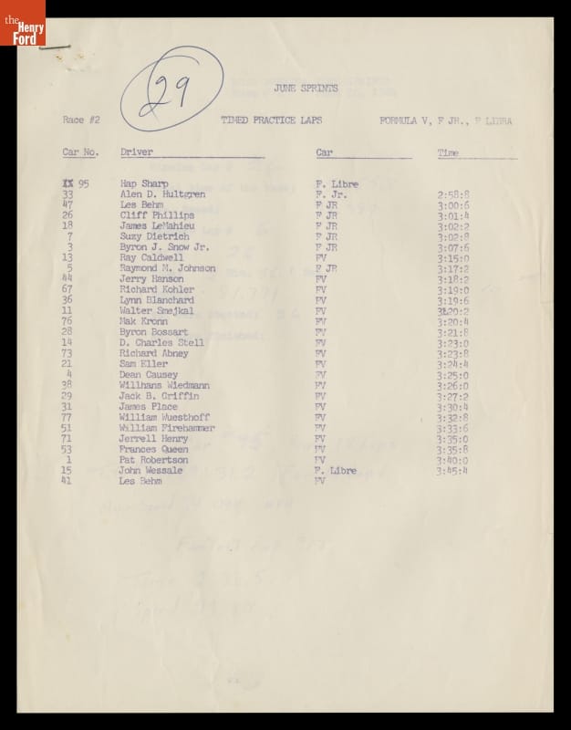 Dave Friedman captured and preserved auto racing history through his photography and memorabilia. His collection documents key races, cars, drivers, and teams. This sheet lists results from a contest at the 1964 Road America International June Sprints, a series of races held at Elkhart Lake, Wisconsin, and sanctioned by the Sports Car Club of America.