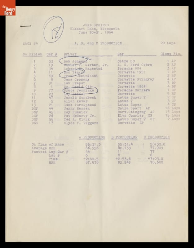 Dave Friedman captured and preserved auto racing history through his photography and memorabilia. His collection documents key races, cars, drivers, and teams. This sheet lists results from a contest at the 1964 Road America International June Sprints, a series of races held at Elkhart Lake, Wisconsin, and sanctioned by the Sports Car Club of America.