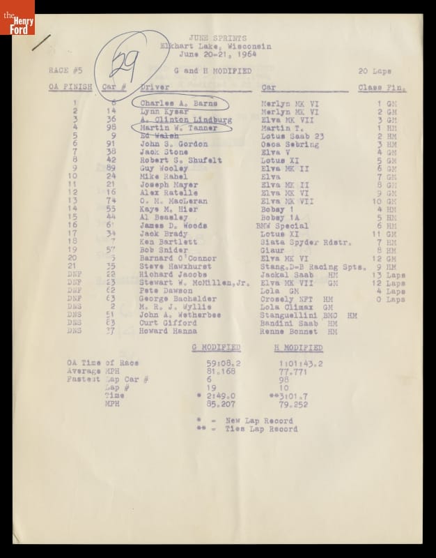 Dave Friedman captured and preserved auto racing history through his photography and memorabilia. His collection documents key races, cars, drivers, and teams. This sheet lists results from a contest at the 1964 Road America International June Sprints, a series of races held at Elkhart Lake, Wisconsin, and sanctioned by the Sports Car Club of America.