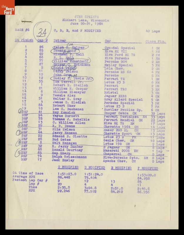 Dave Friedman captured and preserved auto racing history through his photography and memorabilia. His collection documents key races, cars, drivers, and teams. This sheet lists results from a contest at the 1964 Road America International June Sprints, a series of races held at Elkhart Lake, Wisconsin, and sanctioned by the Sports Car Club of America.