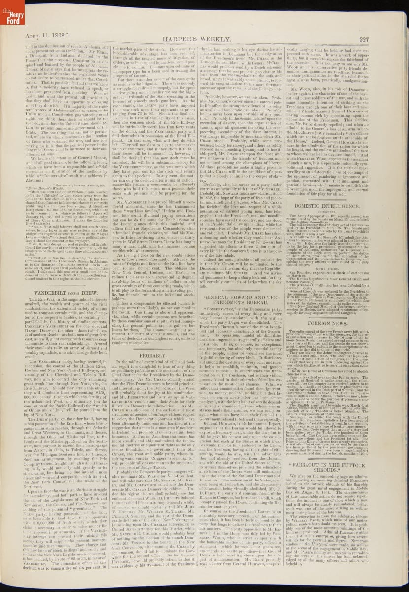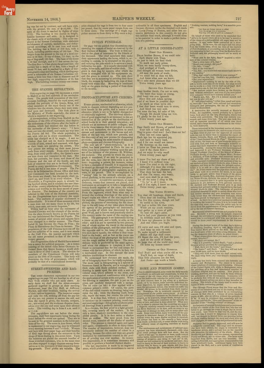 Harper's Weekly began publishing in 1857. Published by Harper & Brothers, issues contained news articles, literary works, essays, and illustrations depicting life in America and around the world. Harper's Weekly ceased publication in 1916.