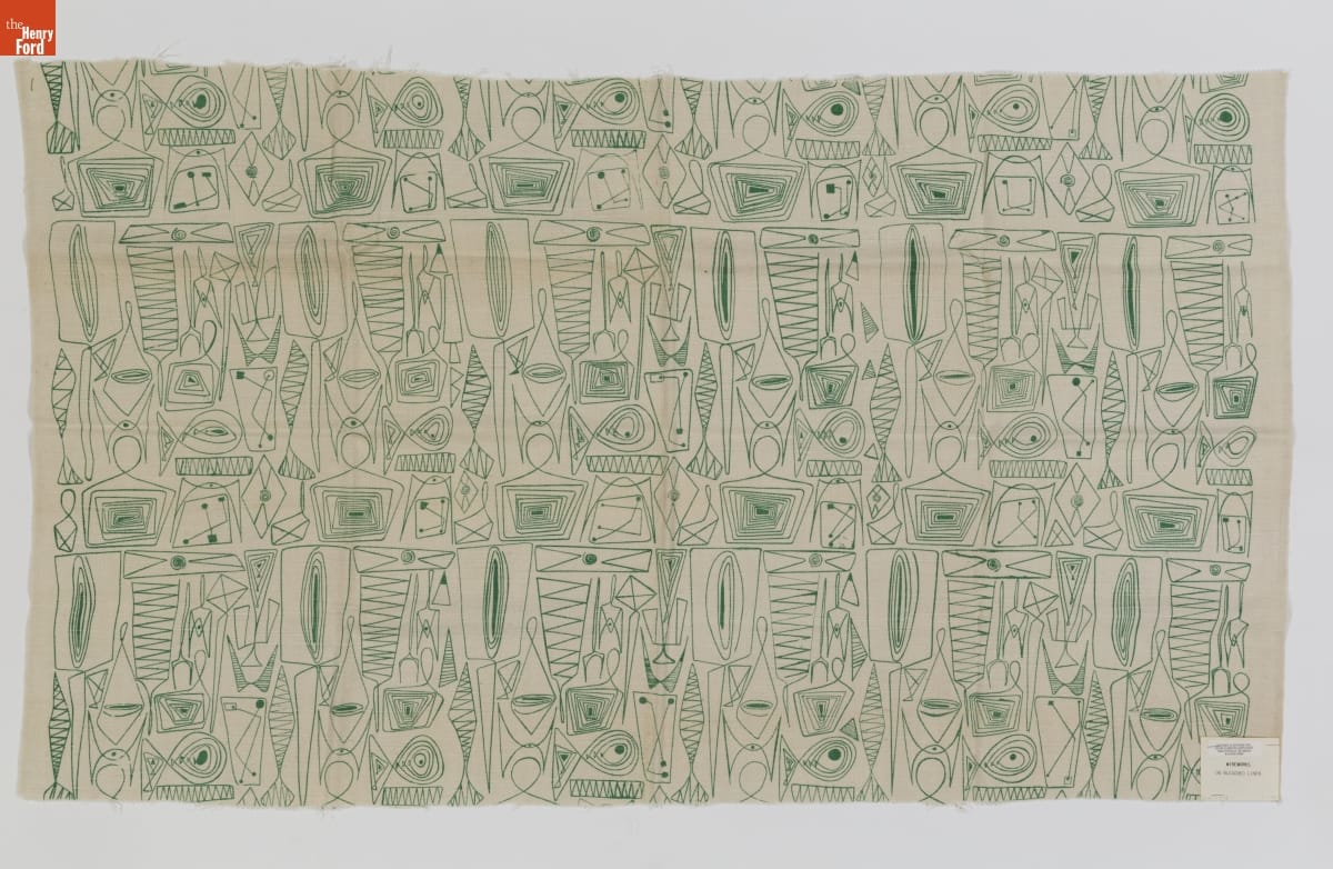Pioneering designer Ruth Adler Schnee was trained in architecture and first began designing textiles when her architectural projects demanded more modern designs than were available on the market. This need launched her career in textile design. Both natural and man-made environments inspire her work. This textile was inspired by the fireplace tools she encountered during a trip to the studio of renowned sculptor Alexander Calder.