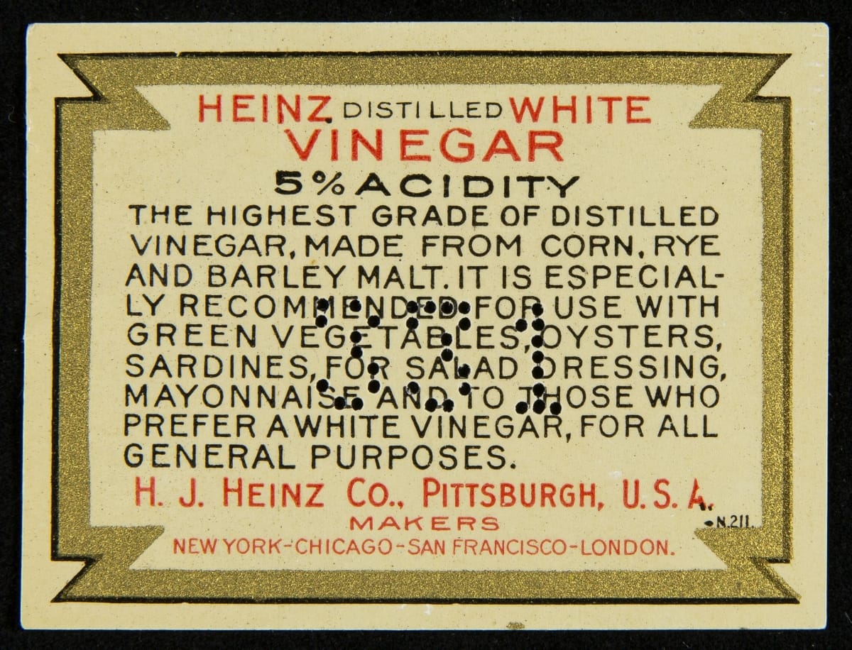 Back Label, "H. J. Heinz Brand Distilled White Vinegar," 1888-1940