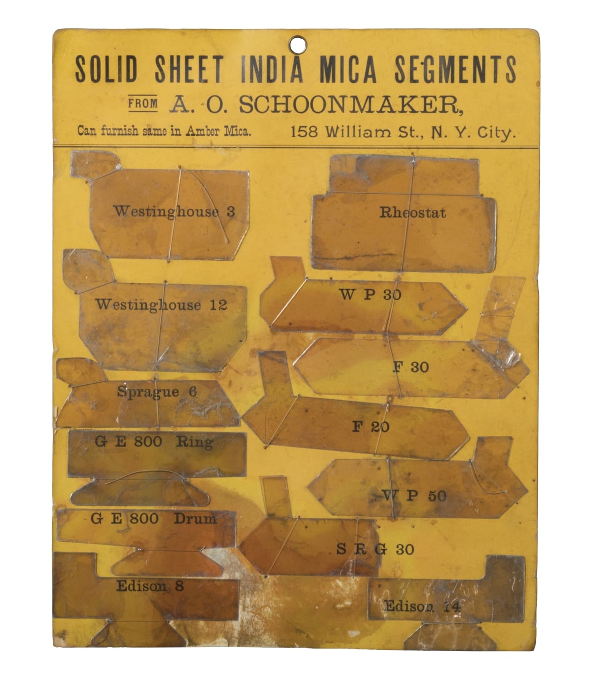 SOLID SHEET INDIA MICA SEGMENTS / FROM A. O. SCHOONMAKER / Can furnish same in Amber Mica. 158 William St., N. Y. City.