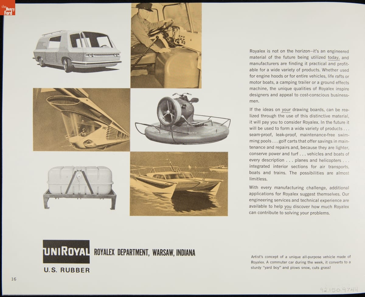 United States Rubber promoted its "Royalex" material in this brochure from 1965. The vinyl and styrene plastic composite could be molded into any shape at almost any thickness, making it particularly versatile. While this brochure suggests several different applications, Royalex saw its most widespread use in the manufacture of canoe hulls.