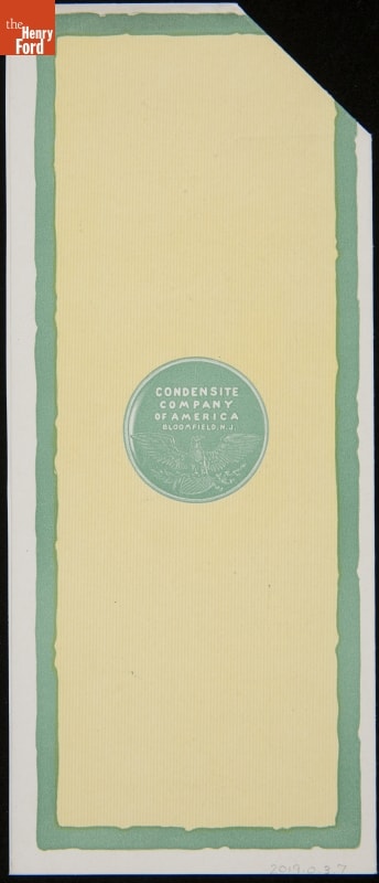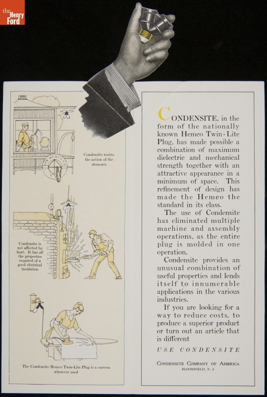Chemically synthetic plastics were developed in the early 1900s to replace shellac and hard rubber -- naturally derived substances increasingly in demand for various industrial applications. The Condensite Company of America formed in 1910 to sell a new material first developed at Thomas Edison's West Orange laboratory for phonograph records. Durable and nonconductive, Condensite was well suited for electrical products.