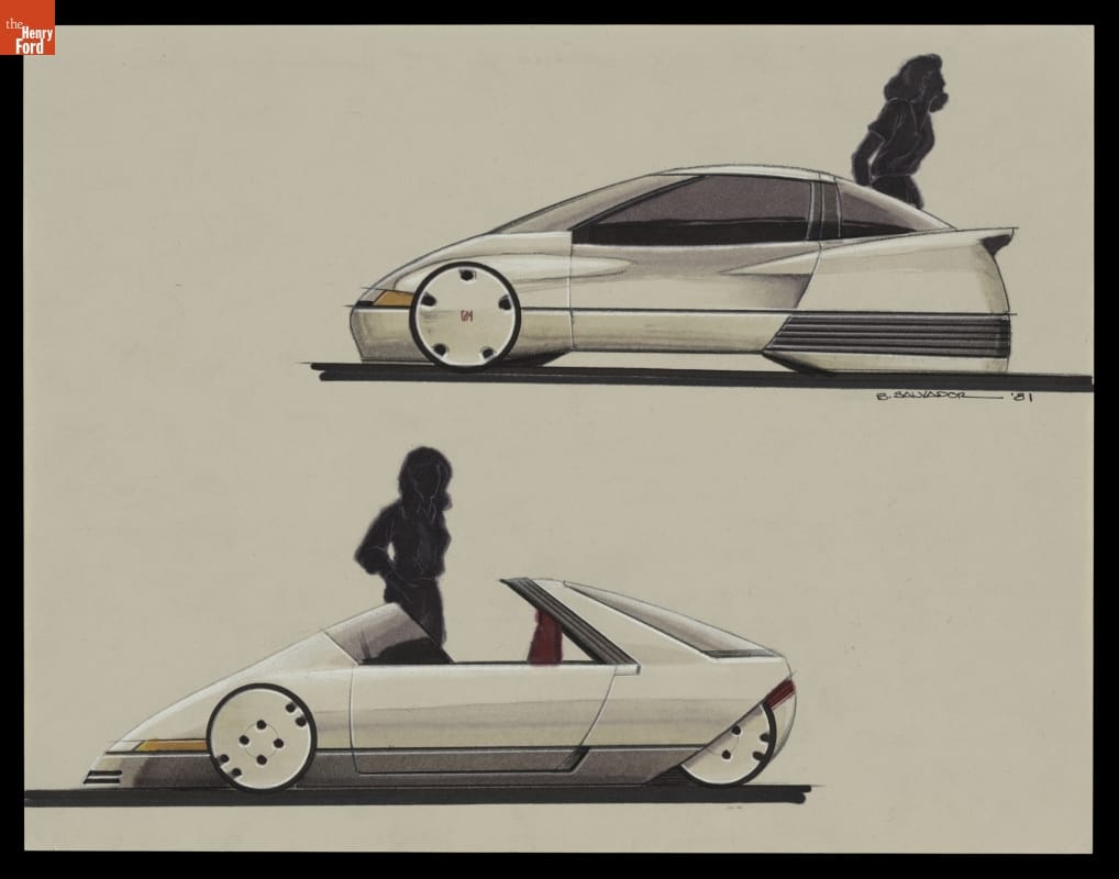 The mid-engine Pontiac Fiero debuted for 1984. Initially conceived as a spirited sports car powered by a V-6, Fiero was reworked into a fuel-efficient, two-seat commuter car with a smaller four-cylinder engine. Disappointing sales ended Fiero production after the 1988 model year. GM designer Ben Salvador penned this early concept drawing.