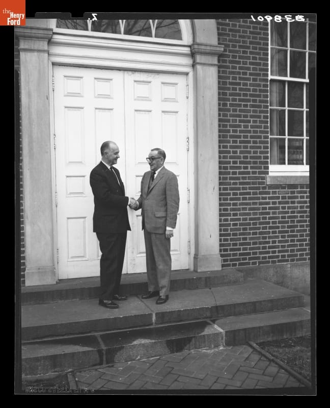 Donald A. Shelley, Executive Director, and Henry Edmunds, Archives Director, outside Henry Ford Museum, December 31, 1964