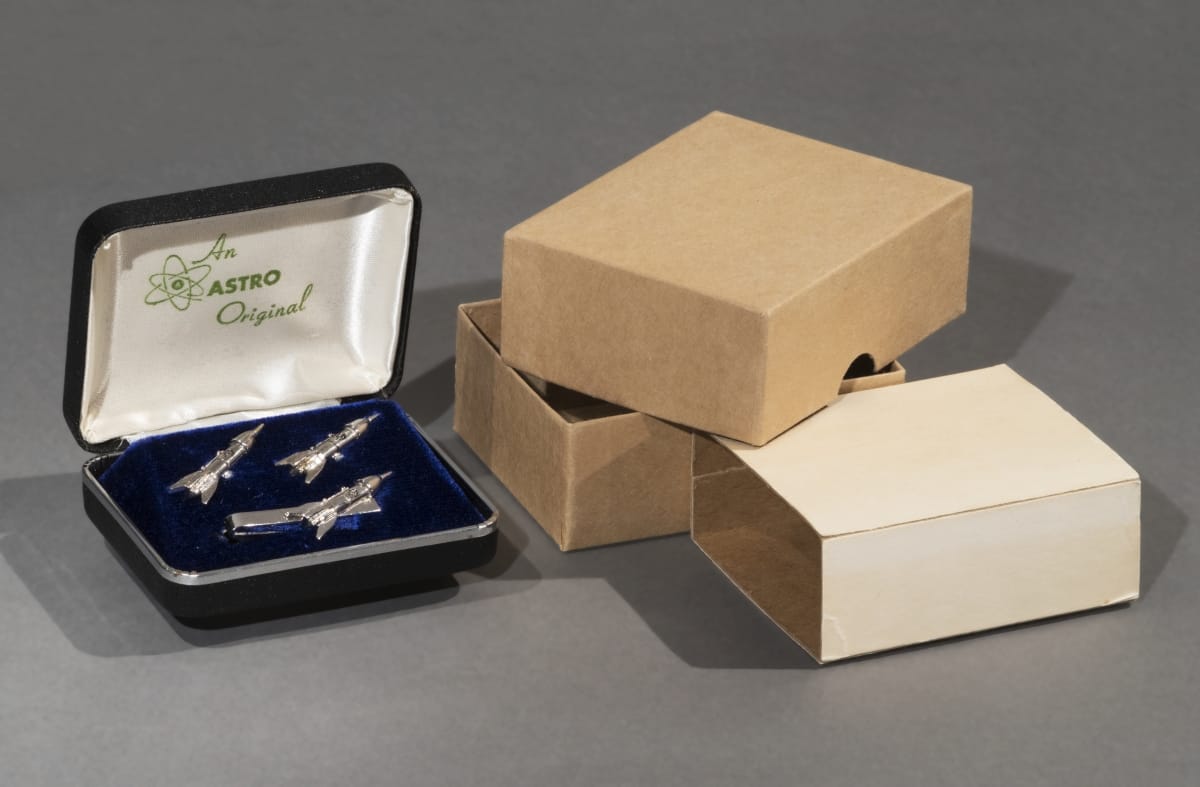 This cuff links and tie clasp set was produced by Astro Manufacturing, the producer of the full-size mechanical version of the bank depicted on them. This so-called Astro Missile Coin Bank, like the other banks produced by this company, drew upon Americans' interest in outer space during the mid-20th century. This set was a free gift when a bank placed its order.