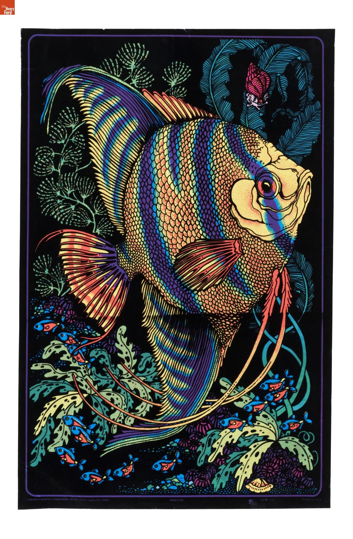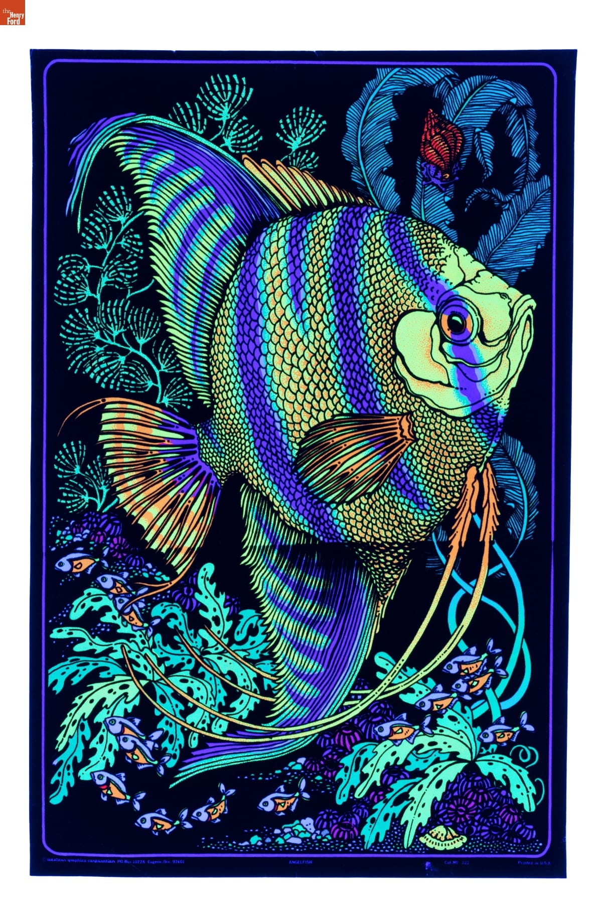 This poster is printed with phosphorescent ink that fluoresces with an uncanny glow under ultraviolet light. These posters were popular with the counterculture and psychedelic music scenes of the 1960s-70s. Common themes include fantastical creatures, landscapes, new age spirituality, pop culture, and political images associated with the Black Power movement. Recently, nightlife culture has helped revive the blacklight aesthetic.