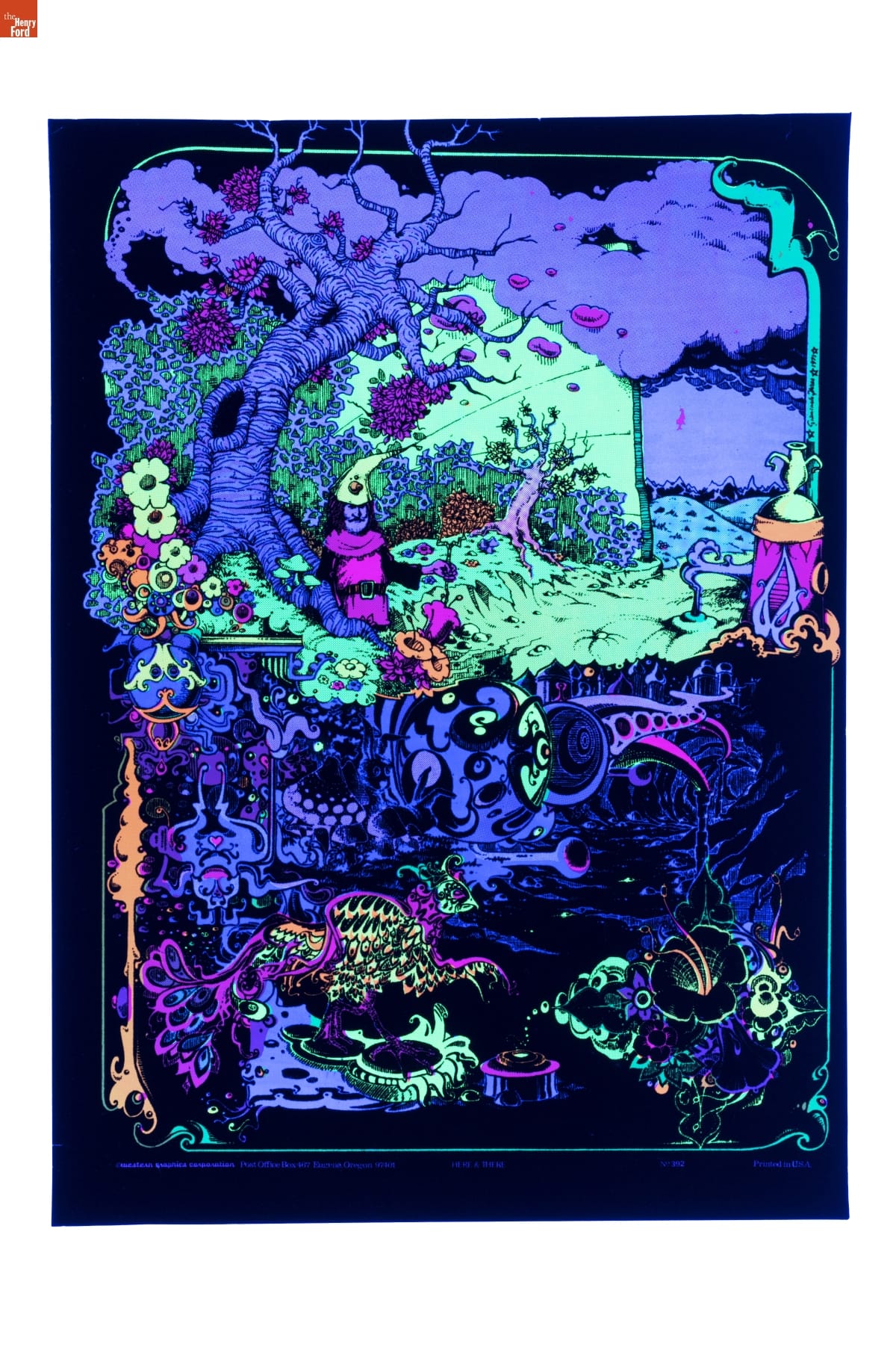 This poster is printed with phosphorescent ink that fluoresces with an uncanny glow under ultraviolet light. These posters were popular with the counterculture and psychedelic music scenes of the 1960s-70s. Common themes include fantastical creatures, landscapes, new age spirituality, pop culture, and political images associated with the Black Power movement. Recently, nightlife culture has helped revive the blacklight aesthetic.