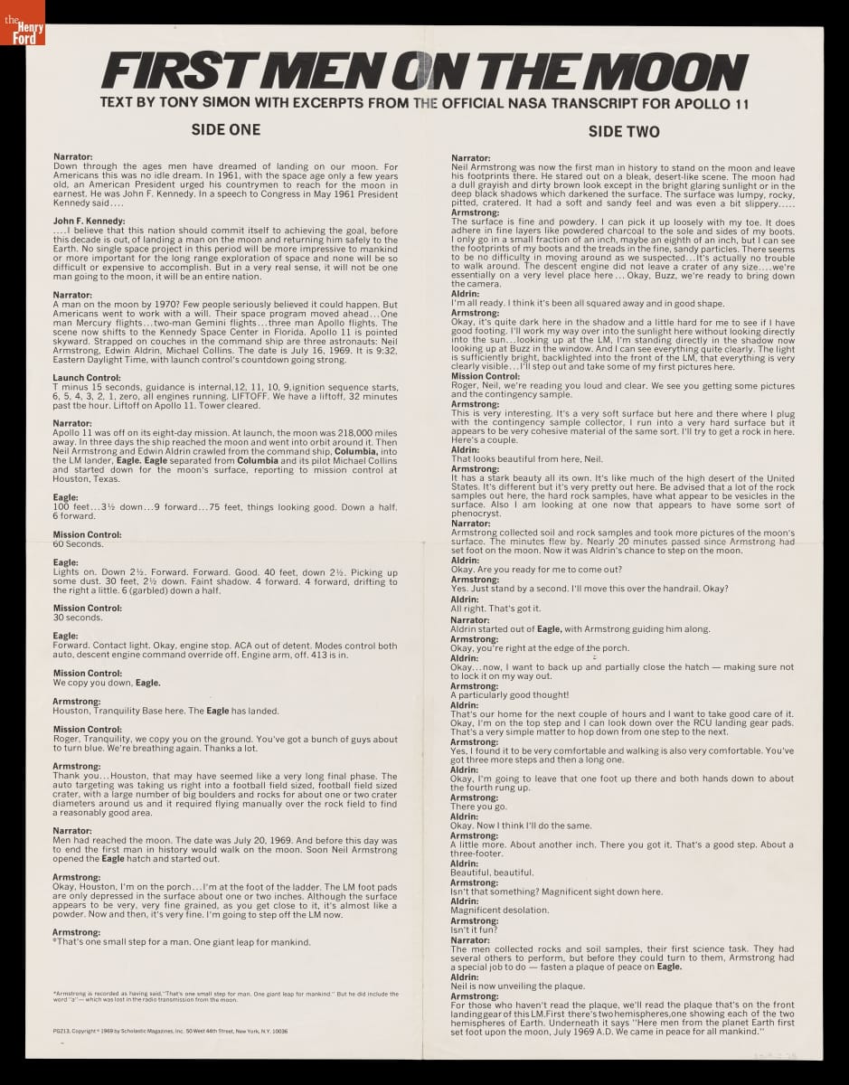 Scholastic Magazines, Inc., a well-respected educational publisher, produced this poster commemorating the Apollo Moon landing missions to accompany the documentary album "First Men on the Moon." Hal Frenck designed the poster with space imagery and the names of early Apollo astronauts and mission modules. On the back, young readers could find the album's text, which included excerpts from official NASA transcripts.