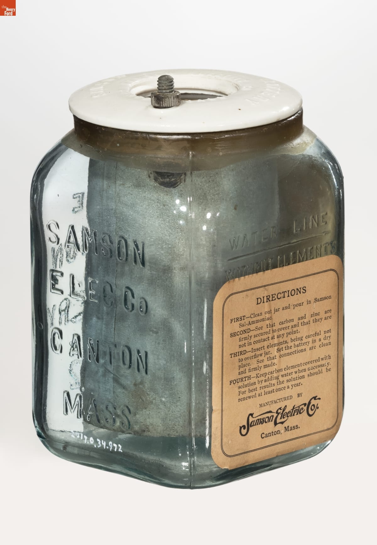 DIRECTIONS / FIRST - Clean out jar and pour in Samson Sal-Ammoniac. / SECOND - See that carbon and zinc are firmly secured to cover and that they are not in contact at any point. / THIRD - Insert elements, being careful not to overflow jar. Set the battery in a dry place. See that connections are clean and firmly made. / FOURTH - Keep carbon element covered with solution by adding water when necessary. For best results the solution should be renewed at least once a year. / MANUFACTURED BY / Samson Electric Co. / Canton, Mass.