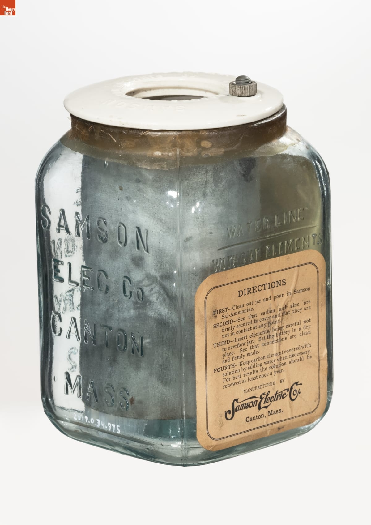 In the late 19th and early 20th centuries, people used batteries to power telegraph and telephone systems, ring bells and alarms, or spark gasoline engines. The Samson Electric Company had made wet cell battery like this one for years before moving production to Canton, Massachusetts. The glass jar held a conductive solution surrounding the carbon and zinc elements that produced an electrochemical reaction.