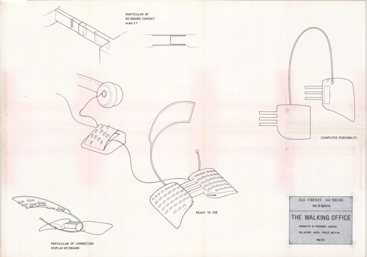 The Walking Office Wearable Computer is a prototype model created by the collaborative design group Salotto Dinamico. This conceptual drawing and an illustrated thesis were submitted by Vincenzo Iavicoli to fulfill his Industrial Design degree. They contain research that informed the prototype: the history of office furniture, office technology, and intangible aspects such as the psychology of work environments.