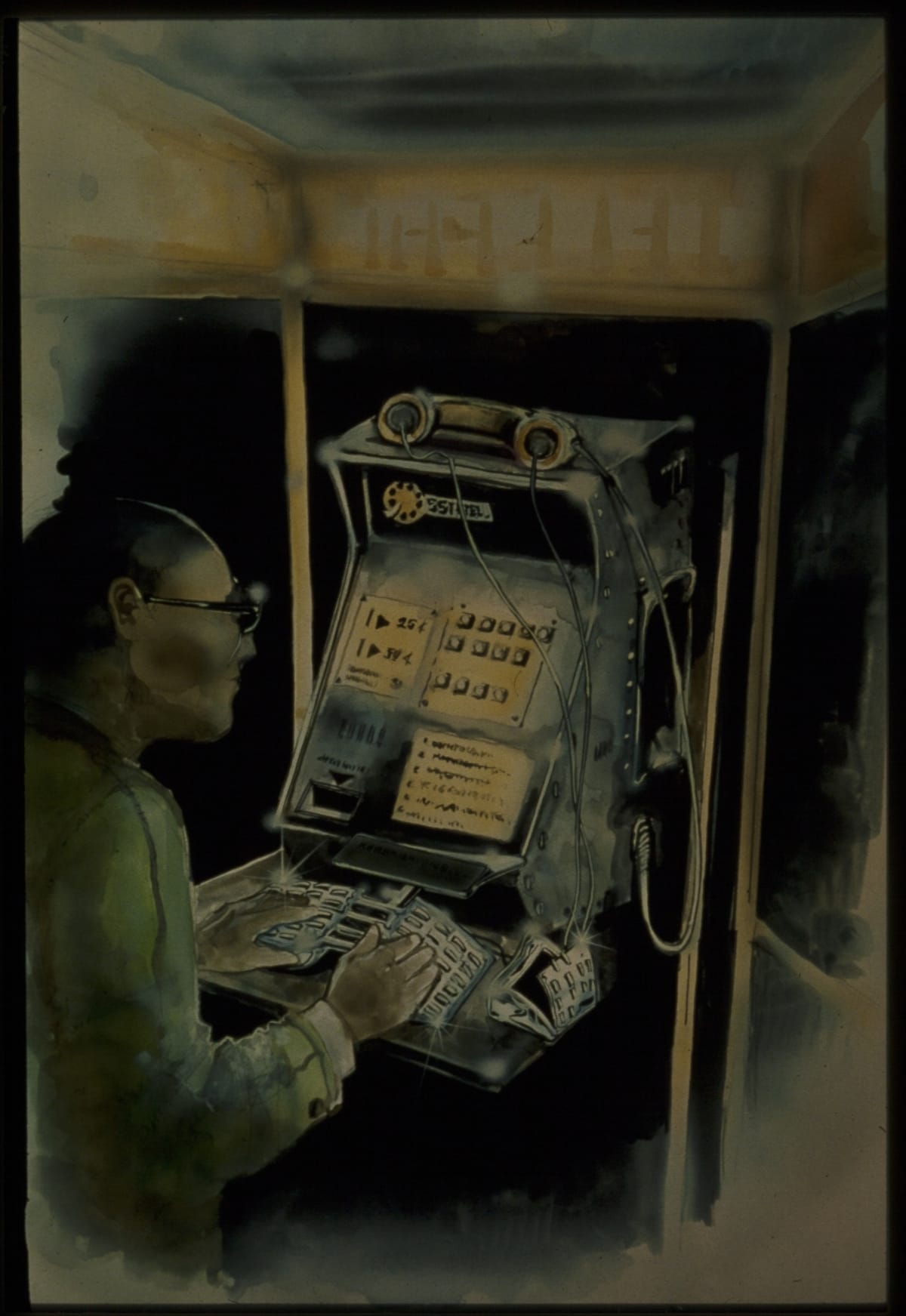 The Walking Office Wearable Computer is a prototype model created by the design group Salotto Dinamico. This proposed device subverted where (and when) the office could be, turning the human body into a mobile workstation. A keyboard, display arc, and cassette recorder became personal adornment--also capable of pairing with an acoustic modem to exchange data through telephone lines.