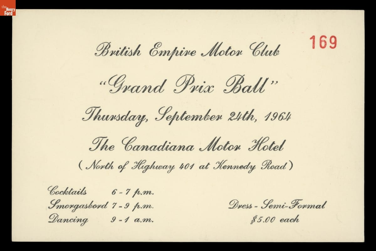 Ticket to "Grand Prix Ball" at the Canadiana Motor Hotel, September 24, 1964