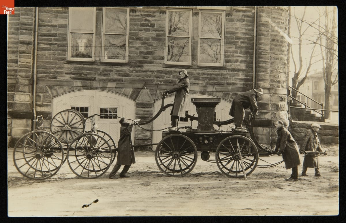 Men Demonstrating 1840 Fire Engine and 1830-1880 Hose Carriage, circa 1930