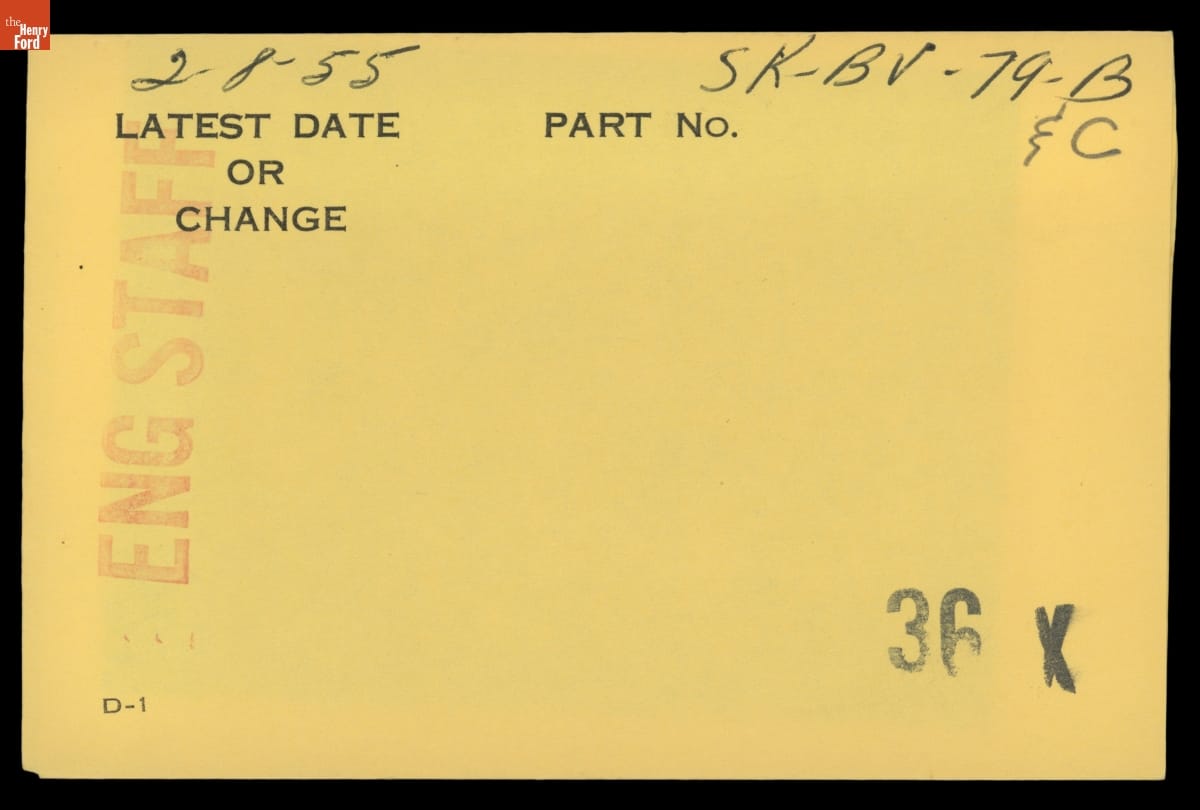 The Ford Motor Company created over a million parts drawings from 1903 to 1957. Many of these drawings specify engineering requirements for the components of Ford-made vehicles--including automobiles, trucks, tractors, military vehicles and Tri-motor airplanes. Others document assembly components, stages of casting and forging, or experimental designs. Beginning in the 1940s, Ford transferred the drawings to microfilm.