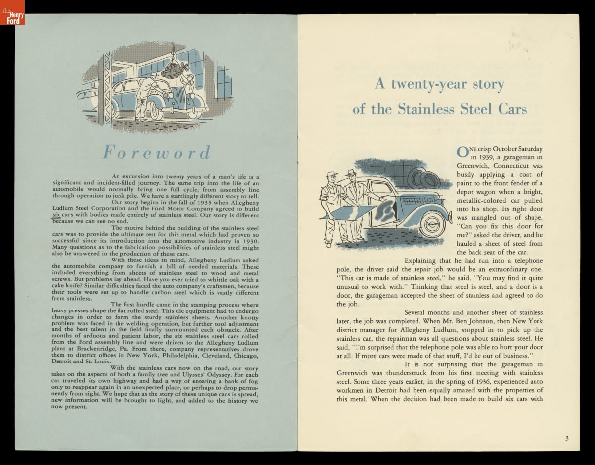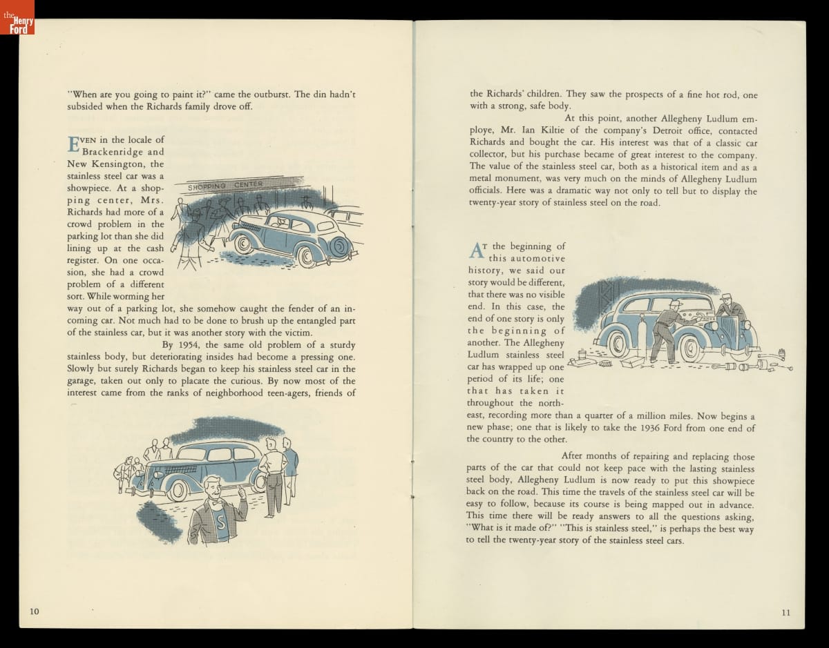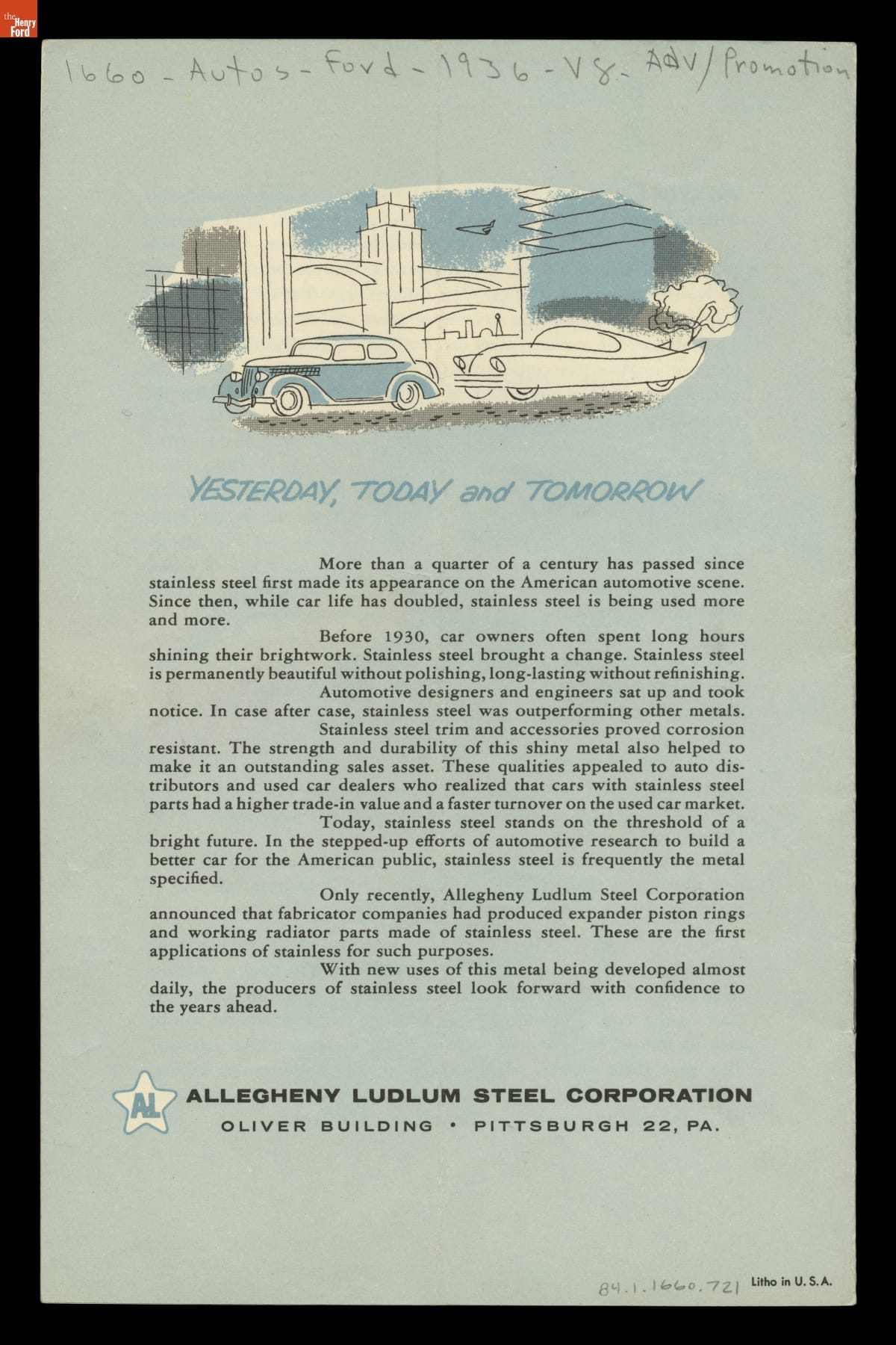 In 1936, Pittsburgh's Allegheny Ludlum Steel Corporation partnered with Ford Motor Company to build six automobiles with stainless steel bodies. The cars promoted the strength and corrosion resistance of Allegheny Ludlum's special high-chromium metal. Each car was driven some 200,000 miles before the fleet was retired in 1946 -- and the rust-free bodies still looked great.