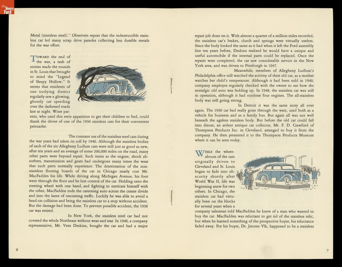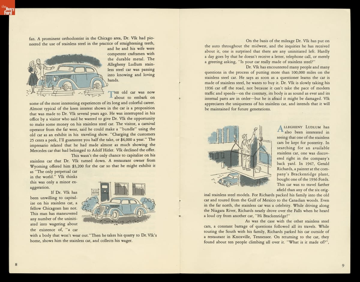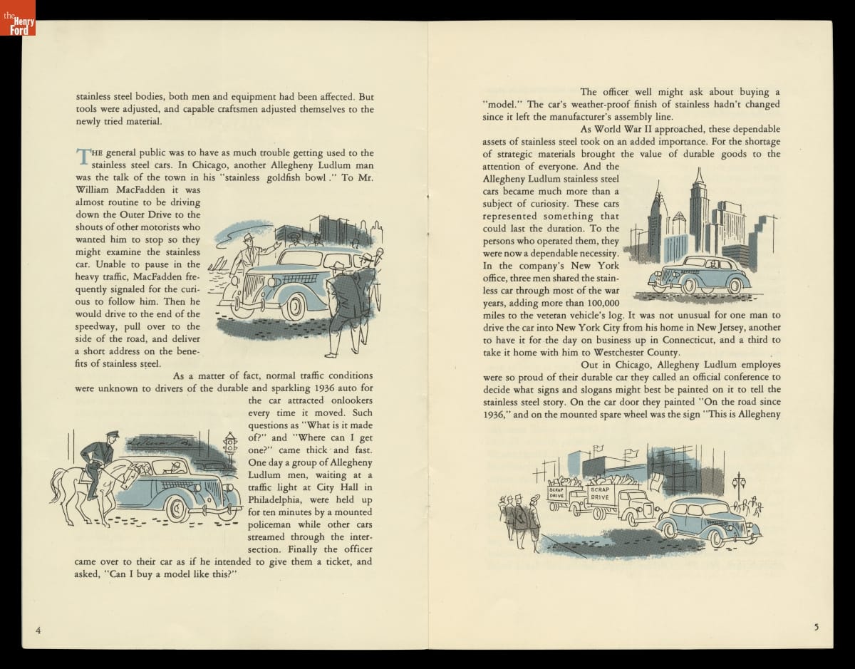 In 1936, Pittsburgh's Allegheny Ludlum Steel Corporation partnered with Ford Motor Company to build six automobiles with stainless steel bodies. The cars promoted the strength and corrosion resistance of Allegheny Ludlum's special high-chromium metal. Each car was driven some 200,000 miles before the fleet was retired in 1946 -- and the rust-free bodies still looked great.